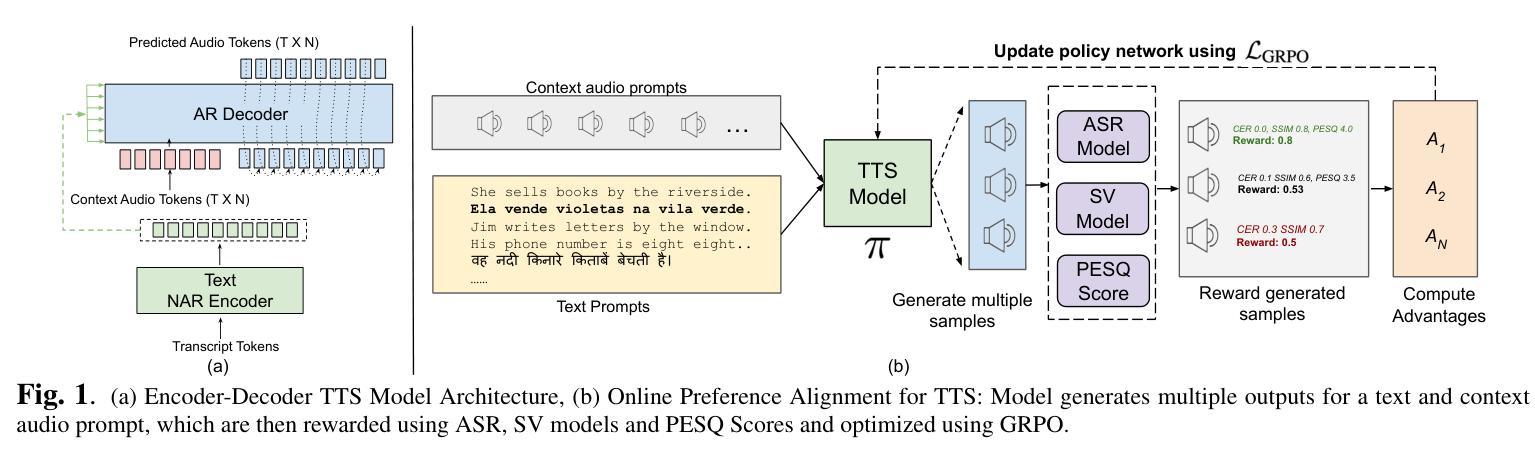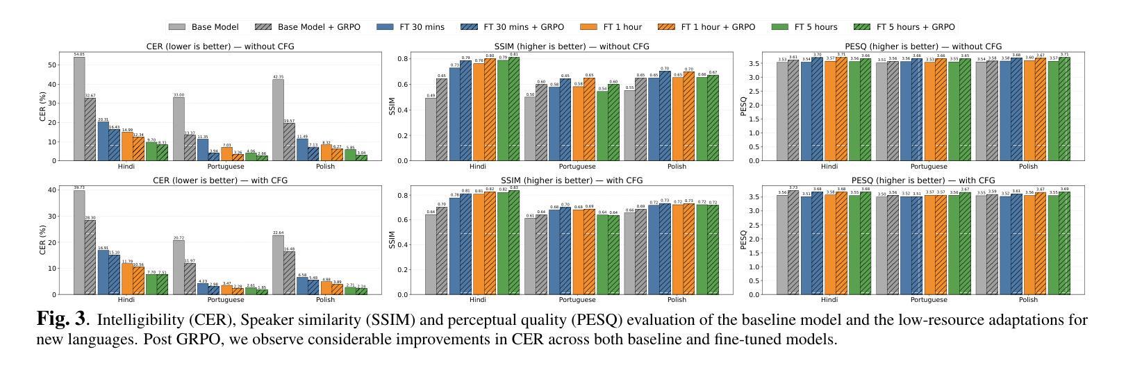 针对低资源语言的优质文本转语音(TTS)系统发展面临挑战,因为文本和语音数据配对稀缺。相比之下,由于大规模多语种预训练的努力,此类语言的自动语音识别(ASR)模型往往更容易获得。我们提出了一种基于组相对策略优化(GRPO)的框架,以适应新的语言的自回归多语种TTS模型。我们的方法首先通过与国际音标(IPA)符号一起训练多语种基线,为TTS合成建立一种语言无关的基础。接下来,我们在新语言的有限配对数据上对此模型进行微调,以捕获目标语言的韵律特征。最后,我们应用GRPO仅使用未配对的文本和说话人提示来优化模型,由预训练的ASR、说话人验证和音频质量估计模型的多目标奖励来指导。实验表明,该管道在资源贫乏的语言中产生可理解的、与说话人一致的语音,明显优于单纯的微调。此外,我们基于GRPO的框架还提高了高资源语言的TTS性能,超越了直接偏好优化(DPO)等离线对齐方法,产生了更高的可理解性、说话人相似性和音频质量。