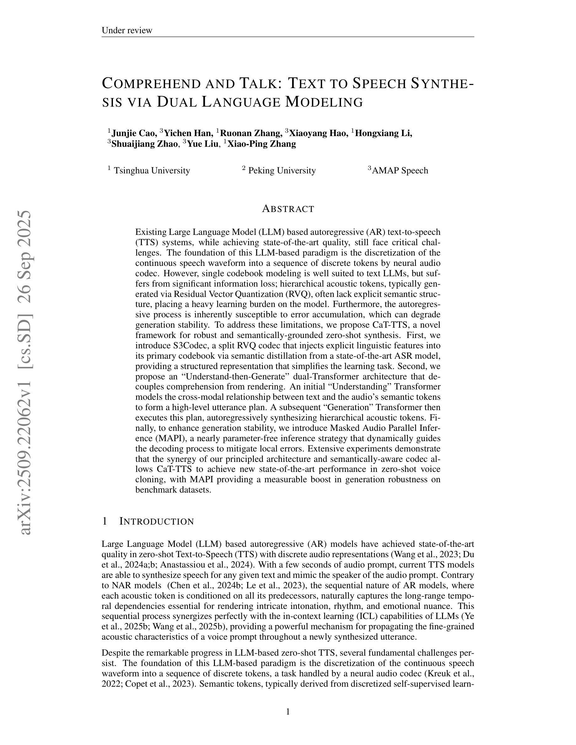 基于大型语言模型(LLM)的自动回归(AR)文本到语音(TTS)系统虽然达到了最先进的水平,但仍面临关键挑战。本文提出CaT-TTS框架,通过引入S3Codec和“理解后生成”的双Transformer架构以及带有Masked Audio Parallel Inference(MAPI)的解码过程,实现了稳健且语义基础的零样本合成。S3Codec将显式语言特征注入主要码簿,提供结构化表示以简化学习任务。“理解后生成”架构将理解和渲染过程解耦,先通过“理解”Transformer建模文本与音频语义标记的跨模态关系,形成高级话语计划,然后通过“生成”Transformer执行该计划,自动回归合成层次化的声学标记。最后,通过引入MAPI策略增强生成稳定性。