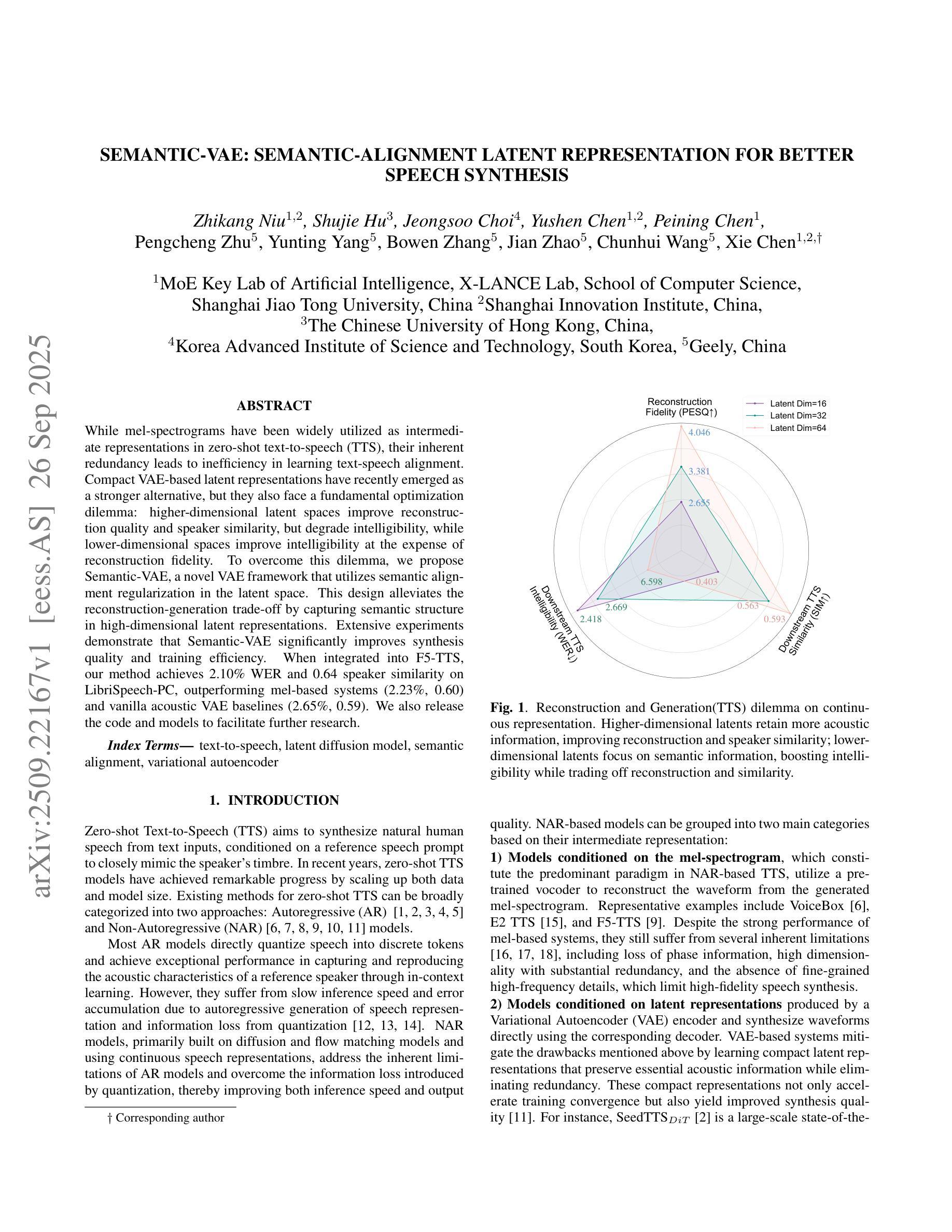 虽然梅尔频谱图已广泛应用于零样本文本到语音(TTS)的中间表示,但其固有的冗余性导致文本语音对齐学习的不高效。基于紧凑变分自动编码器(VAE)的潜在表示最近作为一种更强的替代方案出现,但它们也面临一个基本的优化困境:高维潜在空间提高了重建质量和说话人相似性,但降低了可懂度,而低维空间提高了可懂度却以牺牲重建保真度为代价。为了克服这一困境,我们提出了Semantic-VAE,这是一种新型VAE框架,在潜在空间中使用语义对齐正则化。这种设计通过捕获高维潜在表示中的语义结构,缓解了重建-生成之间的权衡。大量实验表明,Semantic-VAE显著提高了合成质量和训练效率。当集成到F5-TTS中时,我们的方法在LibriSpeech-PC上实现了2.10%的单词错误率和0.64的说话人相似性,优于基于梅尔的系统(2.23%,0.60)和普通的声学VAE基线(2.65%,0.59)。我们还发布了代码和模型,以促进进一步研究。