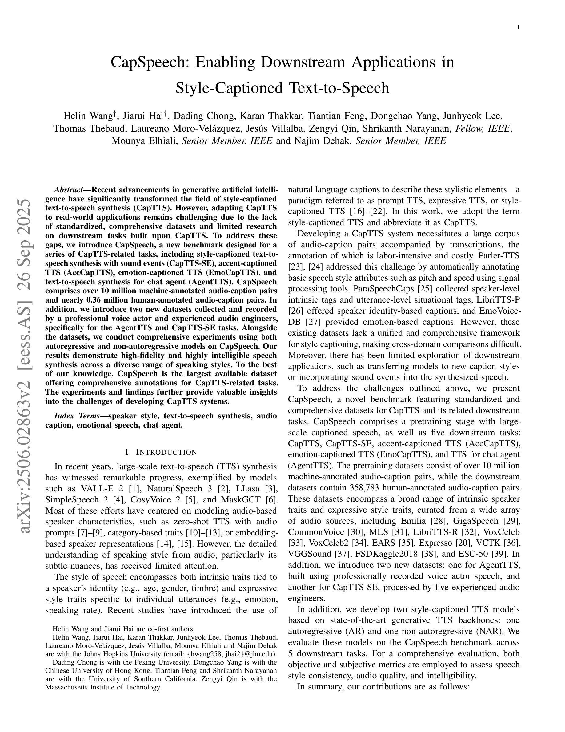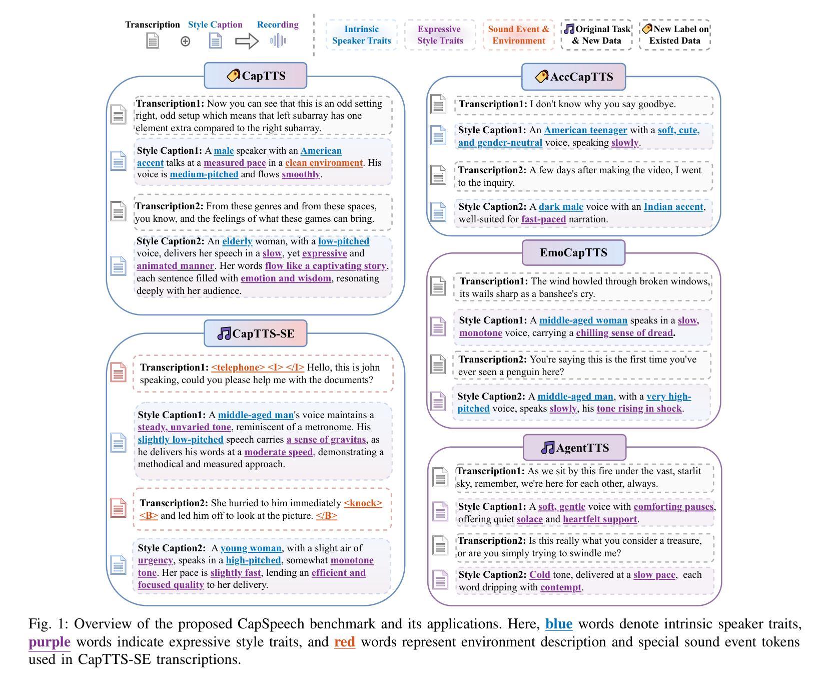 近年来,生成式人工智能的最新进展为带风格标注的文本到语音合成(CapTTS)领域带来了显著变革。然而,由于缺少标准化、全面的数据集以及基于CapTTS的下游任务研究有限,因此将CapTTS适应于现实应用仍然具有挑战性。为了解决这些差距,我们引入了CapSpeech,这是一个为一系列CapTTS相关任务设计的新基准测试,包括带有声音事件的风格标注文本到语音合成(CapTTS-SE)、口音标注的TTS(AccCapTTS)、情感标注的TTS(EmoCapTTS)以及用于聊天代理的文本到语音合成(AgentTTS)。CapSpeech包含超过10万个机器标注的音频字幕对和近36万个人工标注的音频字幕对。此外,我们还专门收集并记录了由专业配音演员和经验丰富的音频工程师针对AgentTTS和CapTTS-SE任务的数据集。除了数据集之外,我们还使用自回归和非自回归模型在CapSpeech上进行了全面的实验。我们的结果表明,在各种不同的讲话风格中,语音合成具有很高的保真度和高度可理解性。据我们所知,CapSpeech是目前为止为CapTTS相关任务提供全面标注的最大可用数据集。实验和发现进一步为开发CapTTS系统提供了宝贵的见解。