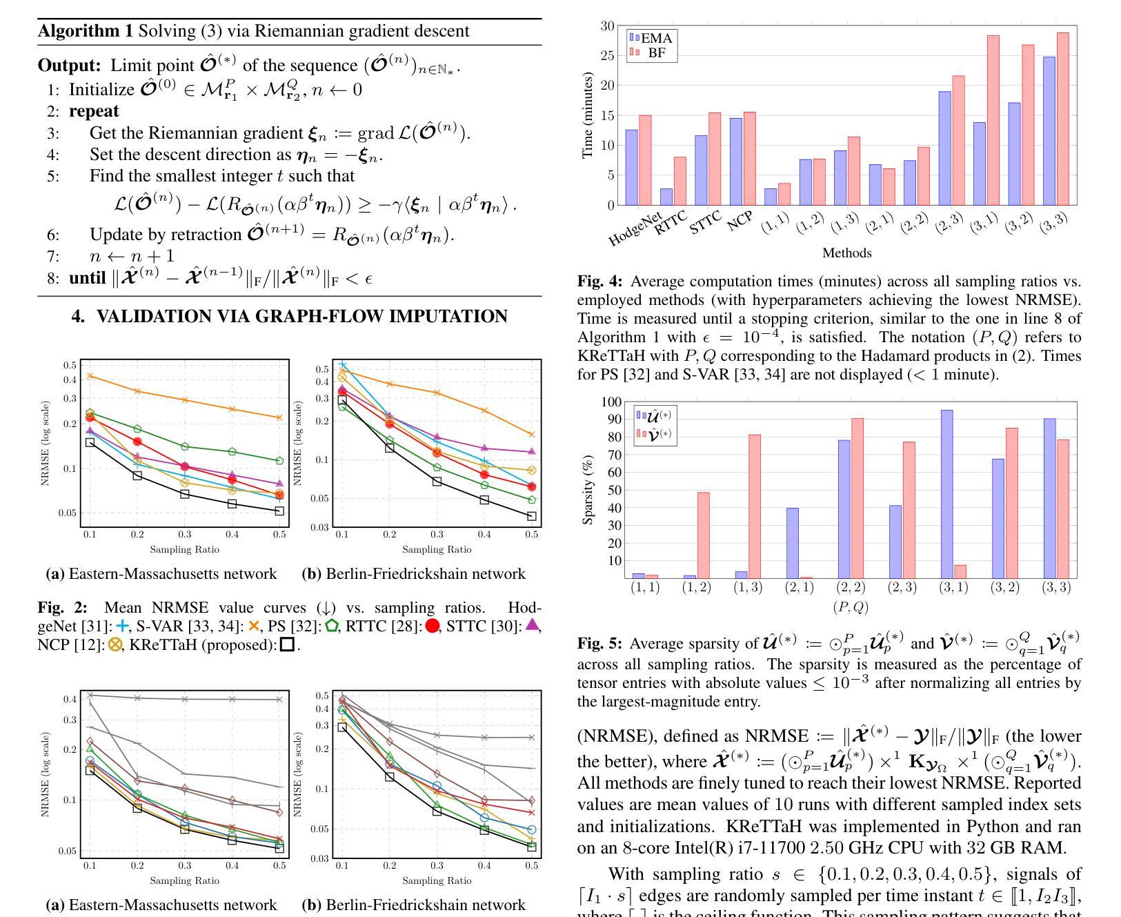 基于回归的多方式数据填充框架Kernel Regression via Tensor Trains with Hadamard overparametrization(简称KReTTaH)被引入。KReTTaH通过将数据填充作为回归转换为再生核希尔伯特空间的方式实现非参数化公式化表达。它通过在固定张量列车(TT)等级张量上实现的参数效率达到高效状态,在相对简单的低维流形上产生矩阵空间的隐层效应;然后通过哈达玛超参数化进一步增强了其效果,在TT参数空间中促进了稀疏性。学习是通过解决固定TT等级张量上的流形平滑反问题来实现的。作为典型应用,考虑了动态图流的估计问题。在这个场景下,KReTTaH展现出了灵活性,能够很好地通过其反问题形式融入基于图的先验知识。在真实图形数据集上的数值测试表明,相较于最新的非参数张量方法以及神经网络方法,KReTTaH具有出色的缺失、时间动态边缘流预测性能。在补齐缺失数据方面表现优异。