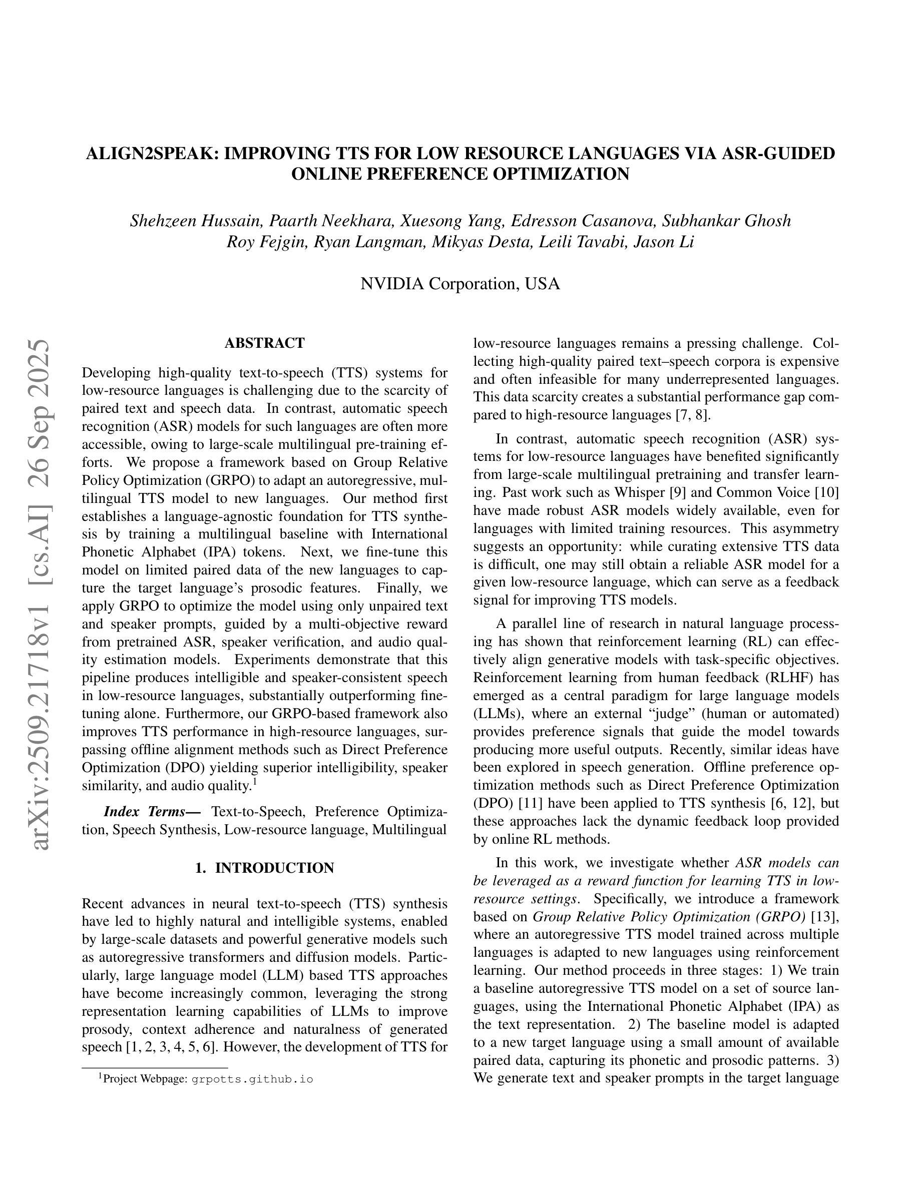 - 文本提出一种基于GRPO的框架来适应低资源语言的TTS系统。