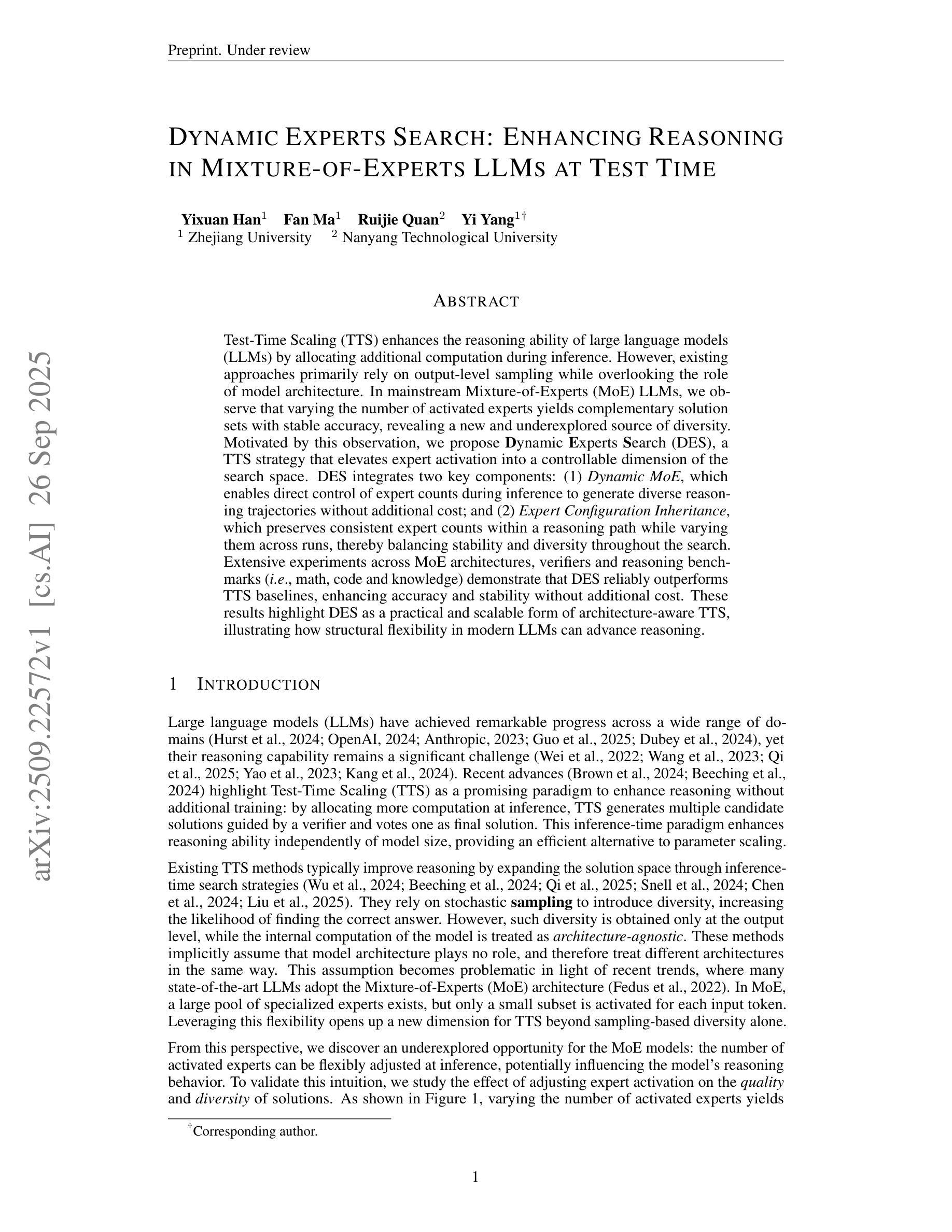 文本中提到的Test-Time Scaling(TTS)通过推理时分配额外的计算资源增强了大型语言模型(LLM)的推理能力。然而,现有的方法主要依赖于输出级别的采样,而忽略了模型架构的作用。本文观察到主流混合专家(MoE)LLM中激活的专家数量不同会产生互补的解决方案集,并具有稳定的准确性,揭示了一种新的未被充分探索的多样性来源。基于此观察,本文提出了Dynamic Experts Search(DES)的TTS策略,将专家激活提升为搜索空间的可控维度。DES包括两个关键组件:动态MoE和专家配置继承。动态MoE能够在推理过程中直接控制专家数量,生成多样化的推理轨迹而无需额外成本;专家配置继承则能够在推理路径内保持一致的专家数量,同时在多次运行中变化它们,从而在搜索中平衡稳定性和多样性。实验表明,DES在MoE架构、验证器和推理基准测试(例如数学、代码和知识)上可靠地优于TTS基线,提高了准确性和稳定性且无需额外成本。这些结果突出了DES作为实用且可扩展的架构感知TTS形式的特点,展示了现代LLM中结构灵活性在推理方面的优势。