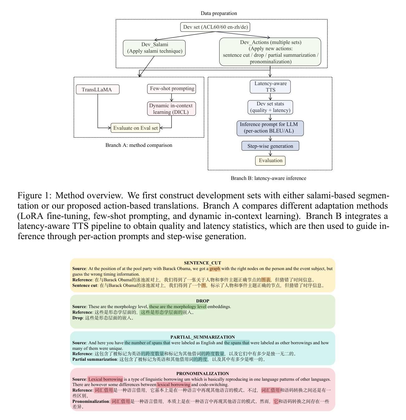 同步机器翻译(SiMT)需要在严格的时间约束下提供高质量的翻译,传统的仅使用READ/WRITE动作的编码器-解码器策略无法完全满足这一需求。研究团队扩展了SiMT的动作空间,增加了四种自适应动作:SENTENCE_CUT、DROP、PARTIAL_SUMMARIZATION和PRONOMINALIZATION,这些动作能够在保持语义保真度的同时,实现实时重构、省略和简化。研究团队在仅包含解码器的大型语言模型(LLM)框架中实现这些动作,并通过动作感知提示构建训练参考。为了评估翻译质量和延迟,研究团队进一步开发了一个延迟感知的文本转语音(TTS)管道,将文本输出映射为具有现实时间节奏的语音。在ACL60/60英语-中文和英语-德语基准测试上的实验表明,该研究框架在语义指标(如COMET-KIWI)上持续提高,与参考翻译和基于沙拉的基线相比,实现了更低的延迟(通过平均滞后测量)。特别是,结合DROP和SENTENCE_CUT动作在流畅性和延迟之间达到了最佳平衡。这一研究结果表明,丰富LLM基于SiMT的动作空间为缩小人机解释之间的差距提供了有前景的研究方向。