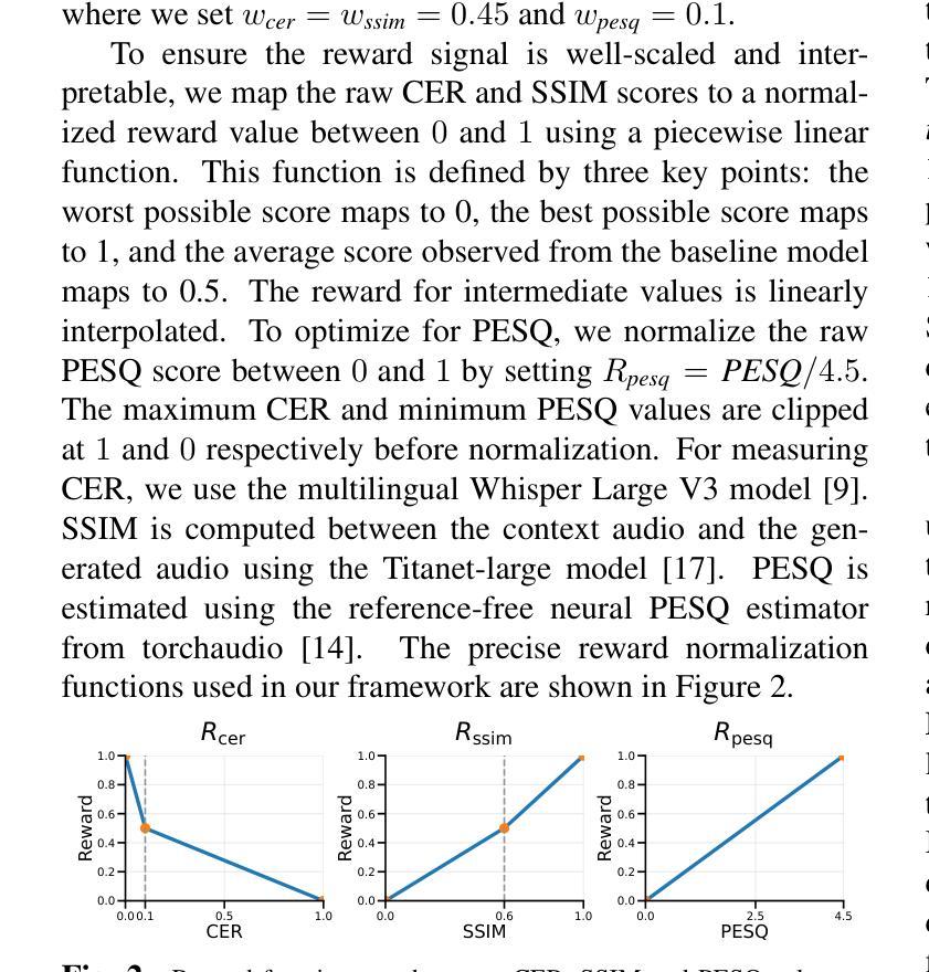 - 使用GRPO优化模型,结合ASR、说话人验证和音频质量估计模型的多元奖励。