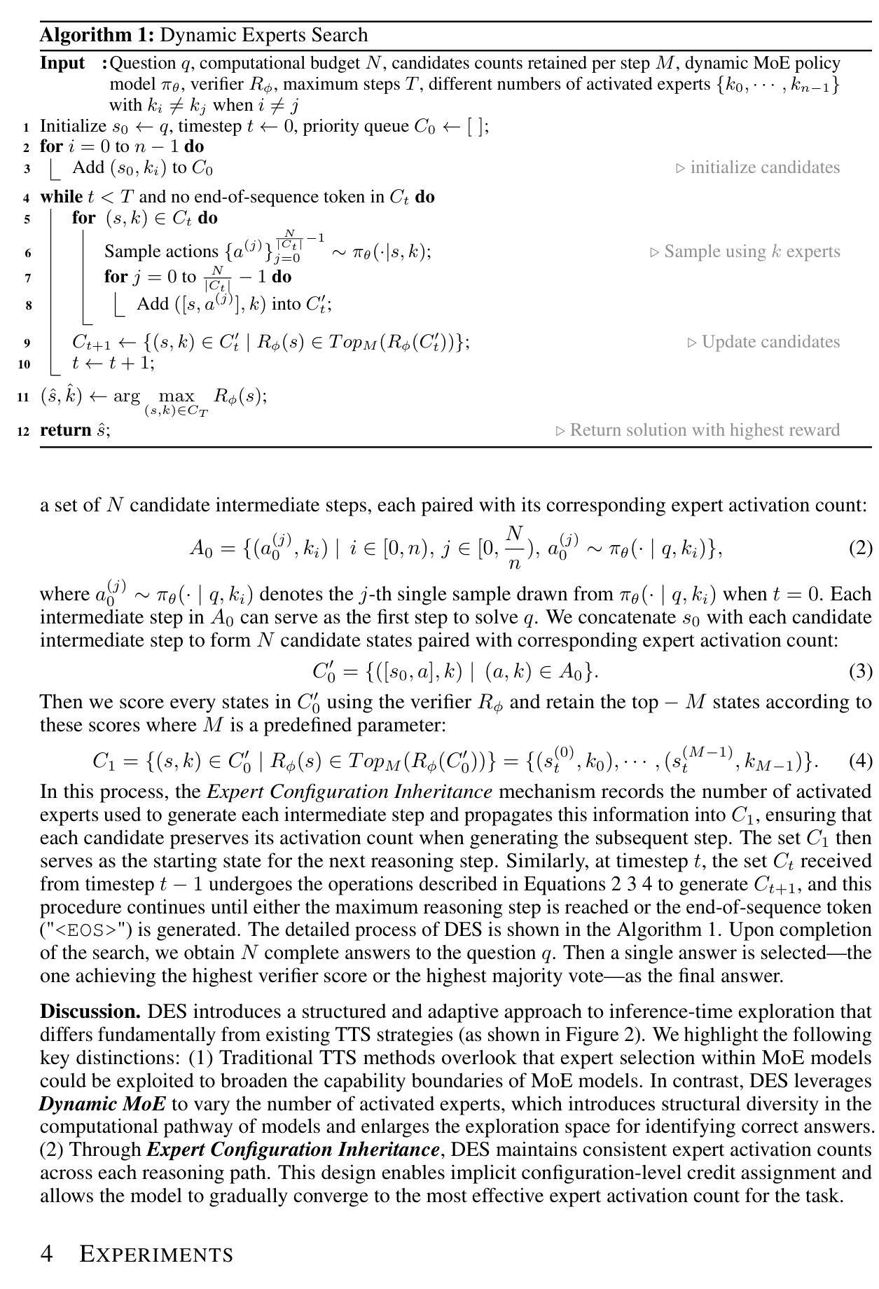 - Dynamic Experts Search (DES) 是一种新的TTS策略,将专家激活作为搜索空间的可控维度。