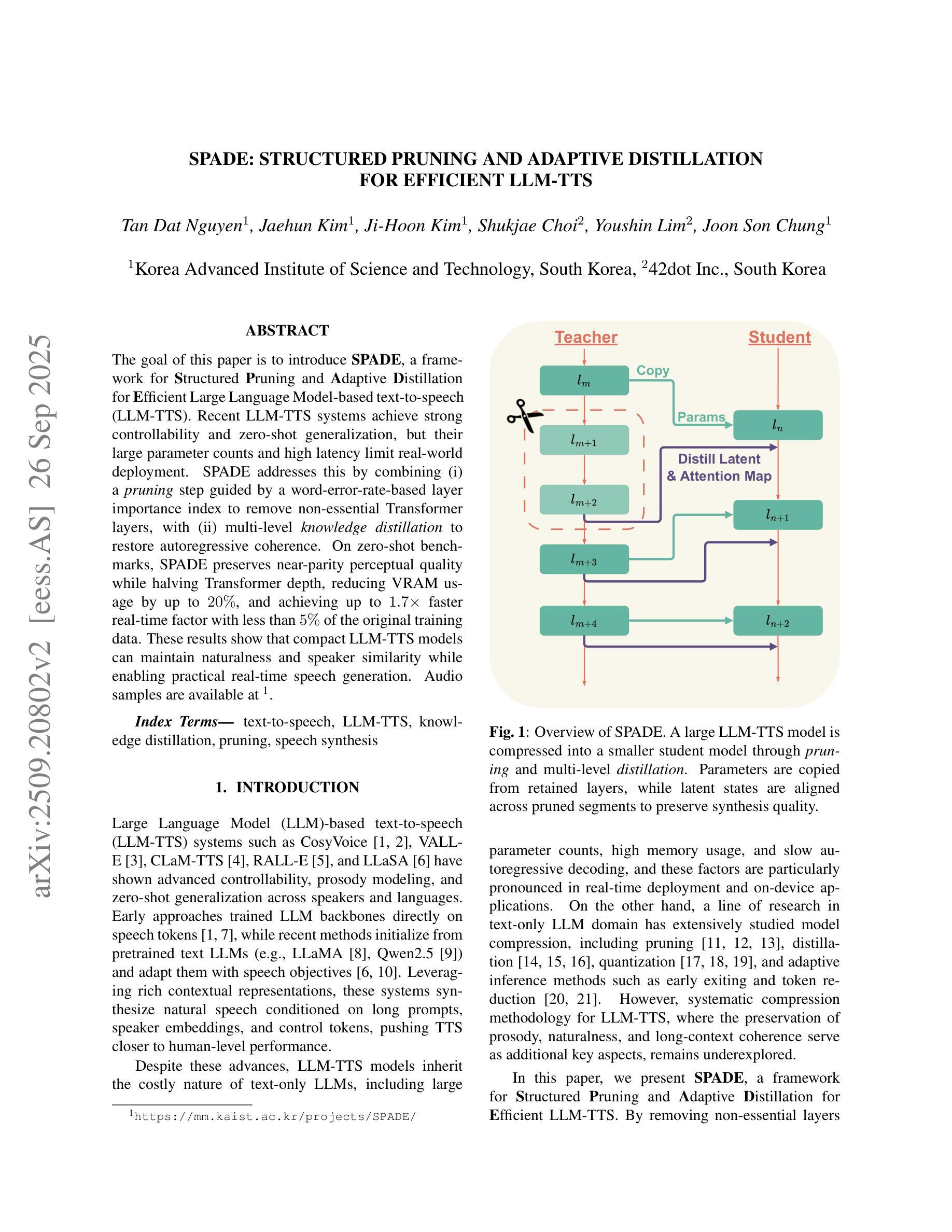 - SPADE是一个针对基于大型语言模型的文本到语音转换(TTS)系统的结构化剪枝和自适应蒸馏框架。
