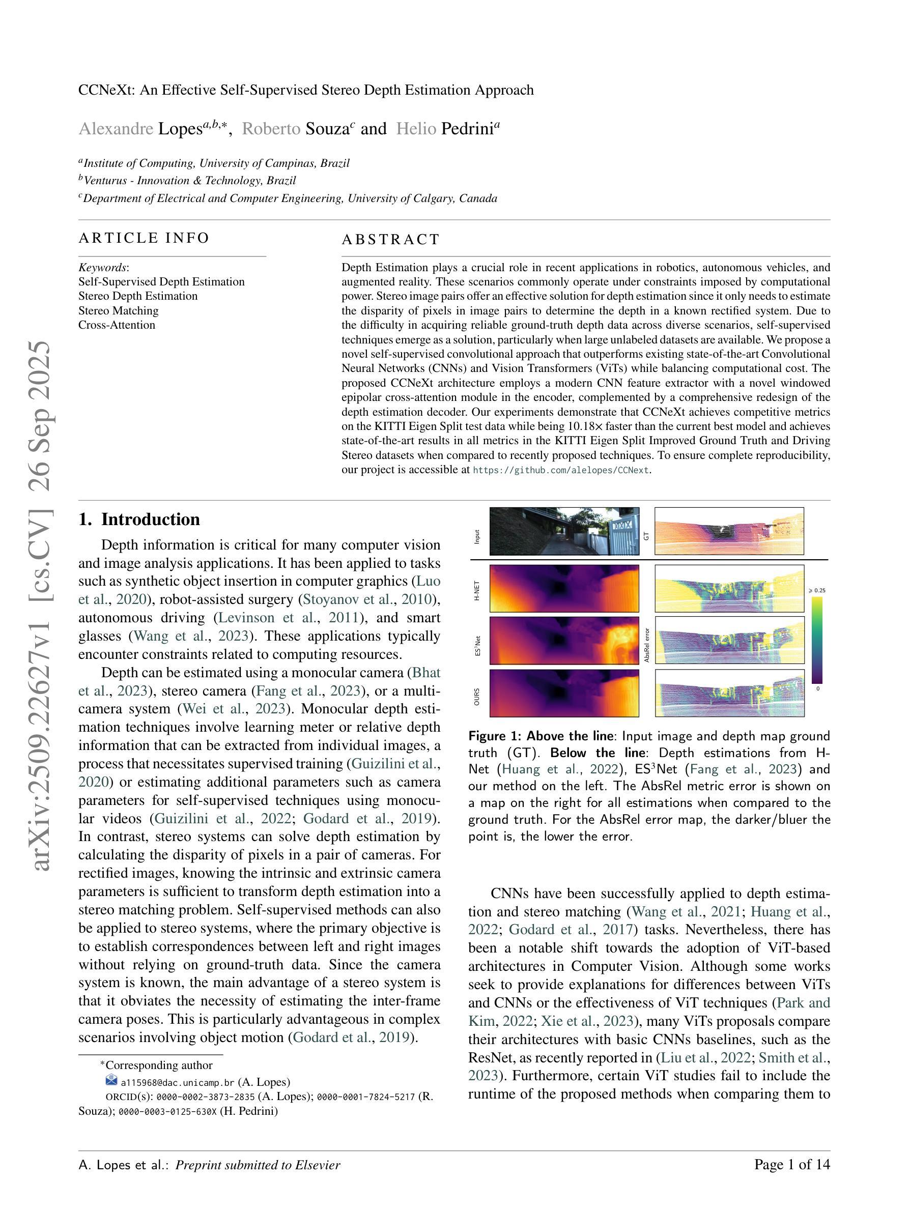 深度估计在机器人技术、自动驾驶汽车和增强现实等现代应用领域中扮演着至关重要的角色。这些场景通常在计算能力的限制下运行。立体图像对为深度估计提供了有效的解决方案,因为在已知的校正系统中,它只需要估计图像对中像素的视差来确定深度。由于在多种场景下获取可靠的地面真实深度数据具有挑战性,自监督技术应运而生,特别是在拥有大量无标签数据集的情况下。我们提出了一种新型自监督卷积方法,在平衡计算成本的同时,超越了现有的最先进的卷积神经网络(CNN)和视觉变压器(ViT)。所提出的CCNeXt架构采用现代CNN特征提取器,在编码器中加入新型窗口化极线交叉注意模块,并对深度估计解码器进行了全面的重新设计。我们的实验表明,CCNeXt在KITTI Eigen Split测试数据上取得了具有竞争力的指标,并且比当前最佳模型快10.18倍。与最近提出的技术相比,在KITTIEigen Split改进地面真实和驾驶立体数据集中,其在所有指标上都达到了最新技术成果。为确保可重复性,我们的项目可通过https://github.com/alelopes/CCNext访问。