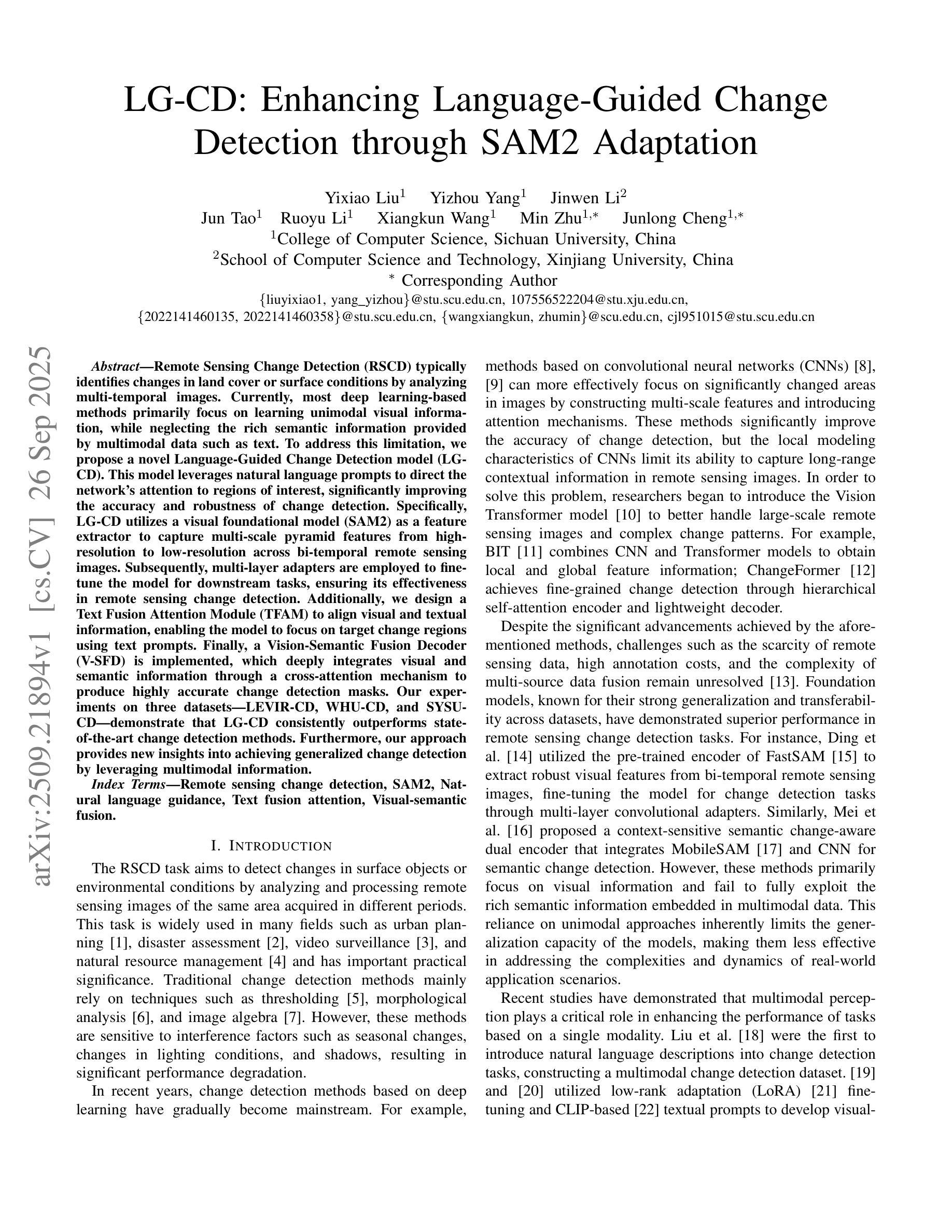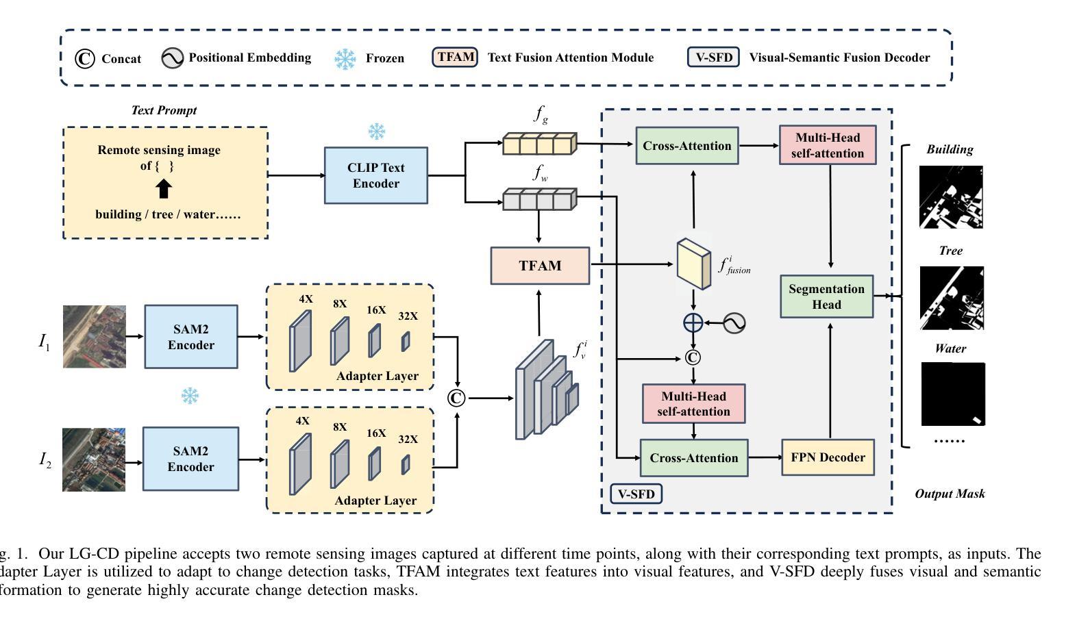 本文提出了一种新型的语言引导变化检测模型(LG-CD),该模型利用自然语言提示引导网络关注感兴趣区域,显著提高了变化检测的准确性和稳健性。LG-CD使用视觉基础模型(SAM2)提取多尺度金字塔特征,通过多层适配器进行微调,适用于遥感变化检测任务。设计文本融合注意力模块(TFAM)对齐视觉和文本信息,使模型能够利用文本提示关注目标变化区域。最后,实现了一个视觉语义融合解码器(V-SFD),通过跨注意力机制深度整合视觉和语义信息,生成高度准确的变化检测掩膜。在三个数据集上的实验表明,LG-CD始终优于最新的变化检测方法。