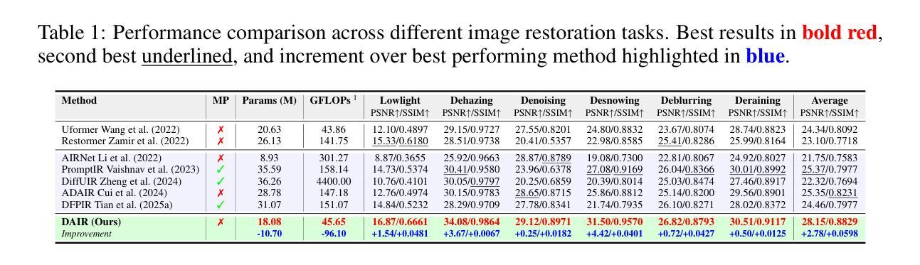 - 实验表明,我们的方法在多个退化任务、复合设置和未知退化上均优于现有最佳方法。