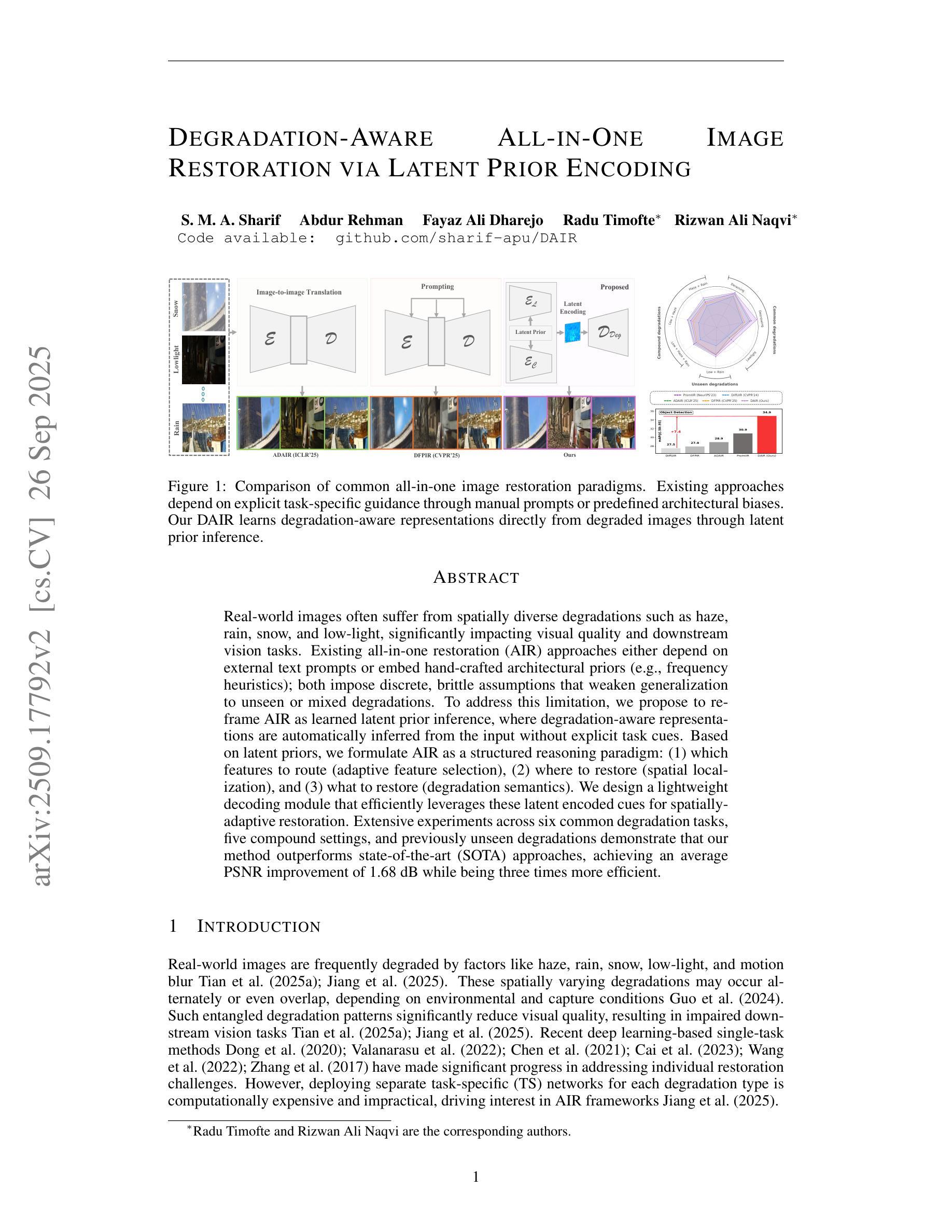 空间多样退化如雾霾、雨水、雪和暗光等会对真实世界图像产生严重影响,现有的综合恢复方法存在缺陷。为此,我们提出一种基于潜在先验推断的方法,自动从输入中推断退化感知表示,并将其结构化为特征路由、恢复位置和退化语义三个方面的推理模式。设计了一种轻量级的解码模块,能高效利用这些潜在线索进行空间自适应恢复。实验表明,我们的方法在六个常见退化任务、五个复合设置和未知退化上均优于现有最佳方法,平均PSNR提高了1.68dB,且效率提高了三倍。