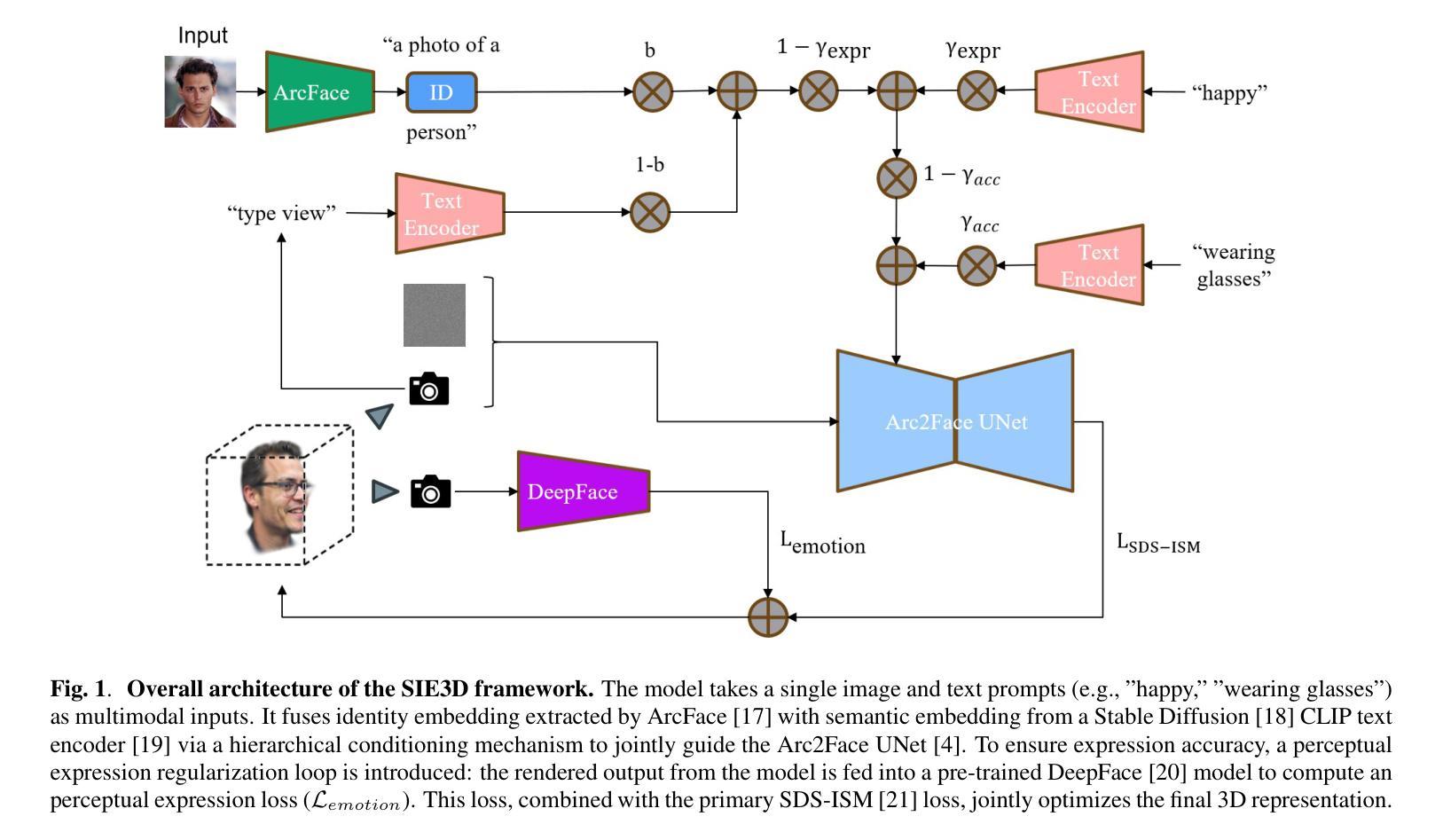 本文提出了一种名为SIE3D的框架,能够从单一图像和描述文本生成具有表情的三维头像。通过创新的条件方案,SIE3D将图像中的身份特征与文本中的语义嵌入相融合,实现了对表情的详细控制。为确保生成的表情与文本相符,引入了一种新型的感知表情损失函数,通过预训练的表情分类器规范生成过程,保证表情的准确性。实验表明,SIE3D在可控性和真实性方面显著提高,在单一消费级GPU上实现了身份保留和表情忠实度方面的超越。
