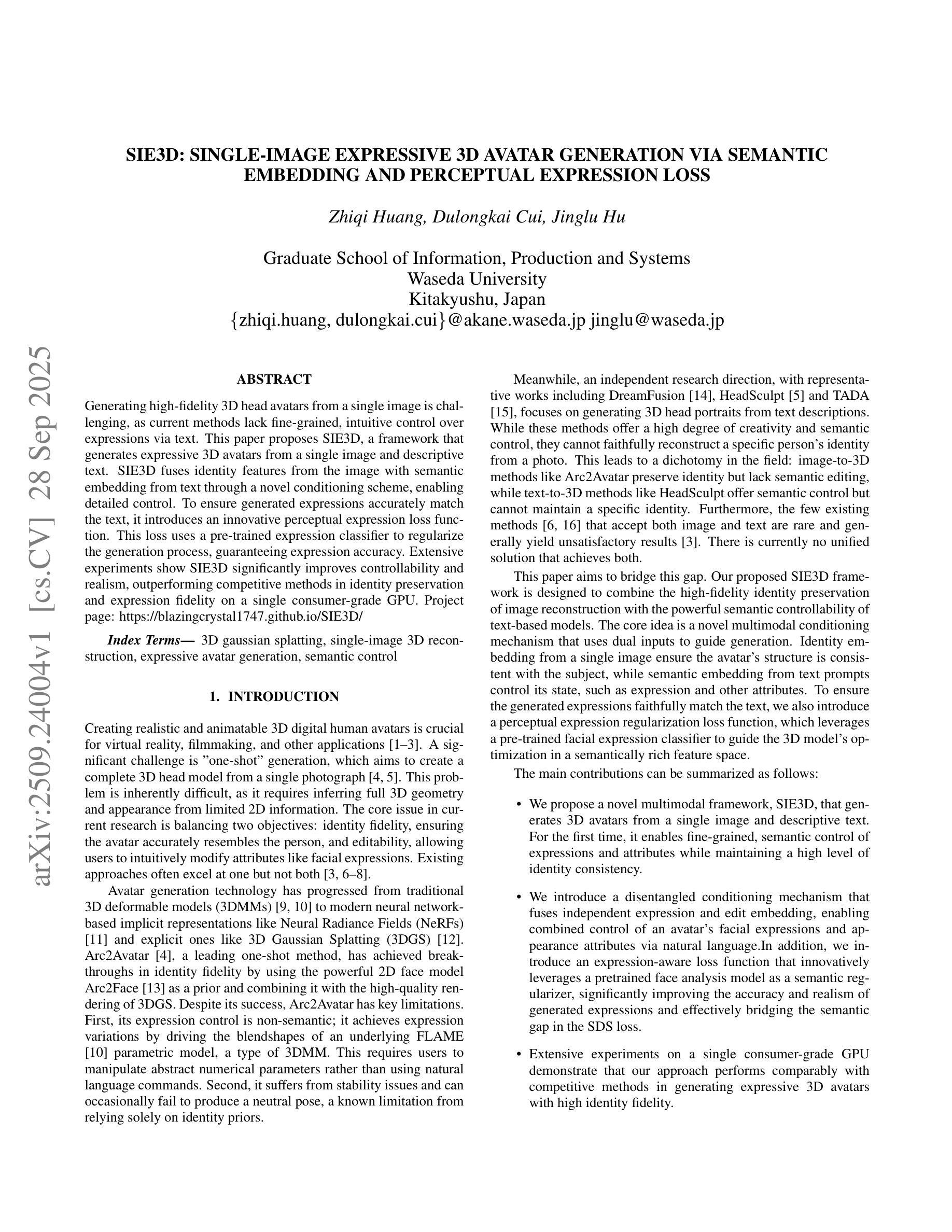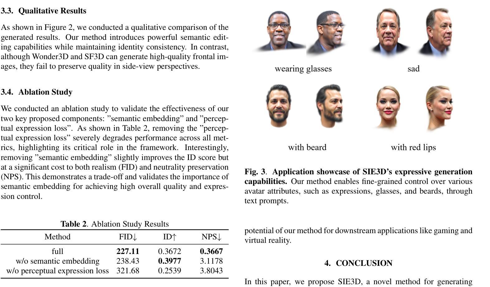 - SIE3D框架能够从单一图像和描述文本生成具有表情的三维头像。