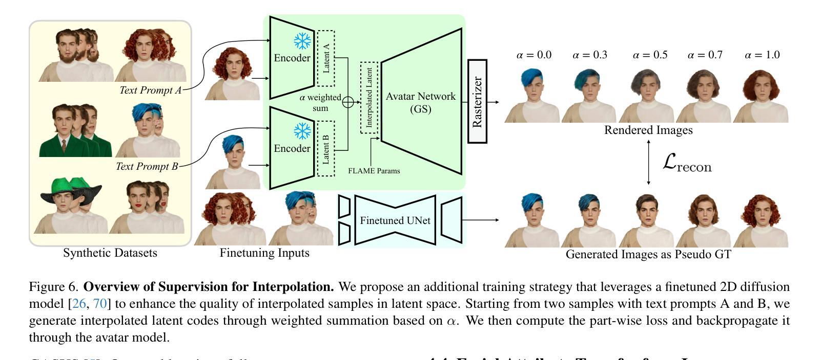 我们提出了PERSE方法,一种从参考肖像构建个性化3D生成化身的方法。我们的化身在一个连续且分离的特征空间中实现了面部特征的编辑,可以控制每个面部特征,同时保留个人的身份特征。为了实现这一点,我们的方法首先合成大规模合成二维视频数据集,每个视频都包含面部表情和视角的一致变化,以及来自原始输入的特定面部特征的变化。我们提出了一种新的流程来生成高质量、逼真的二维视频,带有面部特征编辑功能。利用这个合成特征数据集,我们提出了一种基于3D高斯贴图的个性化化身创建方法,学习一个用于直观面部特征操作的连续且分离的特征空间。为了在这个特征空间中实现平滑过渡,我们引入了特征空间正则化技术,使用插值二维面部作为监督。与以前的方法相比,我们证明PERSE在生成具有插值特征的化身时,能够保留参考个人的身份特征。