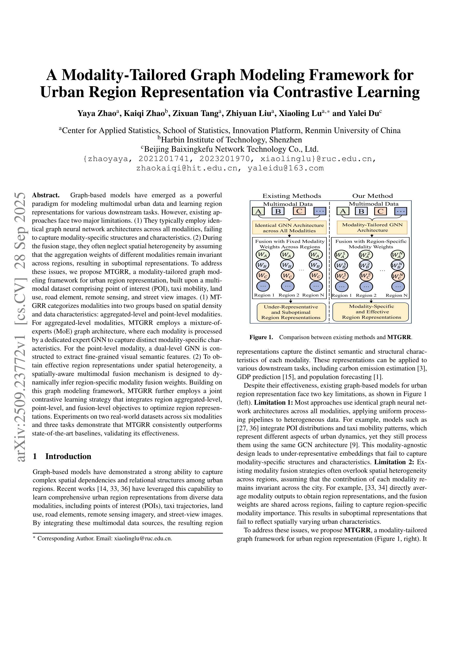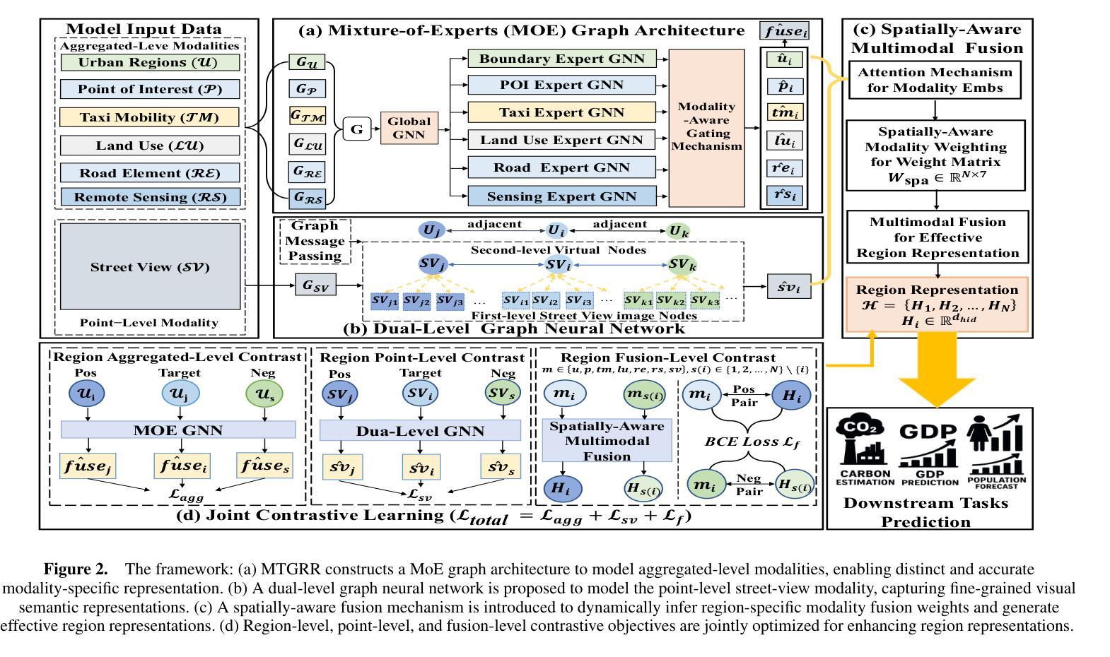 基于图模型的框架已成为处理多模态城市数据的有力工具,并能够用于学习区域表示为多种下游任务提供服务。然而,现有方法面临两大局限。(1)它们通常使用所有模态的相同图神经网络架构,无法捕捉模态特定的结构和特征。(2)在融合阶段,它们往往会忽略空间异质性,假设不同模态的聚合权重在各个区域保持不变,从而导致次优表示。为了解决这些问题,我们提出了MTGRR,这是一种针对城市区域表示的模态定制的图建模框架,建立在包含兴趣点(POI)、出租车流动性、土地利用、道路元素、遥感和街道视图图像的多模态数据集之上。(1)MTGRR根据空间密度和数据特性将模态分为两组:聚合级和点级模态。对于聚合级模态,MTGRR采用混合专家(MoE)图架构,其中每个模态由专门的专家GNN处理以捕获不同的模态特定特征。对于点级模态,构建双级GNN以提取精细粒度的视觉语义特征。(2)为了在空间异质性下获得有效的区域表示,设计了一种空间感知的多模态融合机制,以动态推断特定区域的模态融合权重。基于这个图建模框架,MTGRR进一步采用联合对比学习策略,该策略结合了区域聚合级、点级和融合级目标来优化区域表示。在两个真实世界数据集上的实验证明了MTGRR在六个模态和三个任务上始终优于最新基线,验证了其有效性。