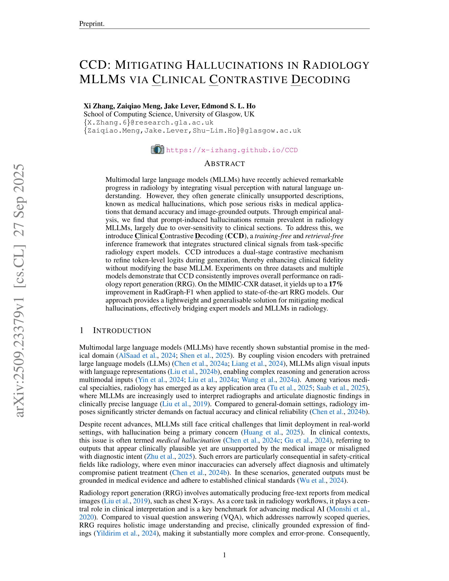 本文介绍了多模态大型语言模型(MLLMs)在放射学领域的最新进展,它们通过融合视觉感知和自然语言理解取得了显著成效。然而,MLLMs常常产生未经临床支持的描述,即所谓的医学幻觉,这在需要精确性和图像基础输出的医学应用中带来了严重风险。研究发现,提示诱导的幻觉在放射学MLLMs中普遍存在,主要是由于对临床部分的过度敏感。为解决这一问题,本文提出了临床对比编码(CCD)技术,这是一种无需训练和检索的推断框架,它整合了来自特定任务放射学专家模型的结构化临床信号。CCD引入了一种双阶段对比机制,在生成过程中优化令牌级别的逻辑,从而提高临床保真度,同时不修改基础MLLM。实验表明,CCD在放射学报告生成方面表现优异,特别是在MIMIC-CXR数据集上应用最先进的RRG模型时,RadGraph-F1得分提高了17%。该方法为缓解医学幻觉问题提供了一种轻便且通用的解决方案,有效地架起了专家模型和MLLMs之间的桥梁。