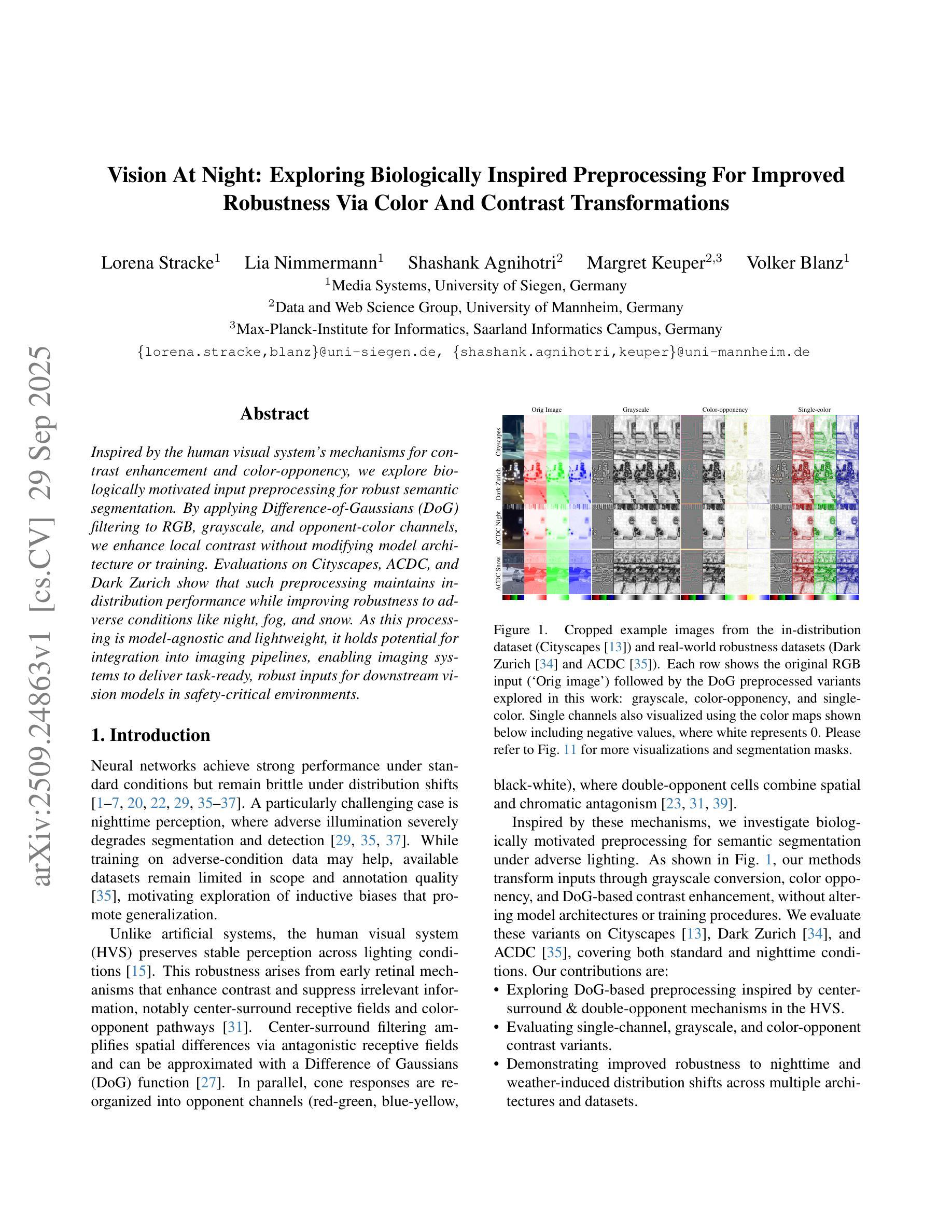 - 研究受人类视觉系统启发,探索了生物动机输入预处理以增强语义分割的稳健性。