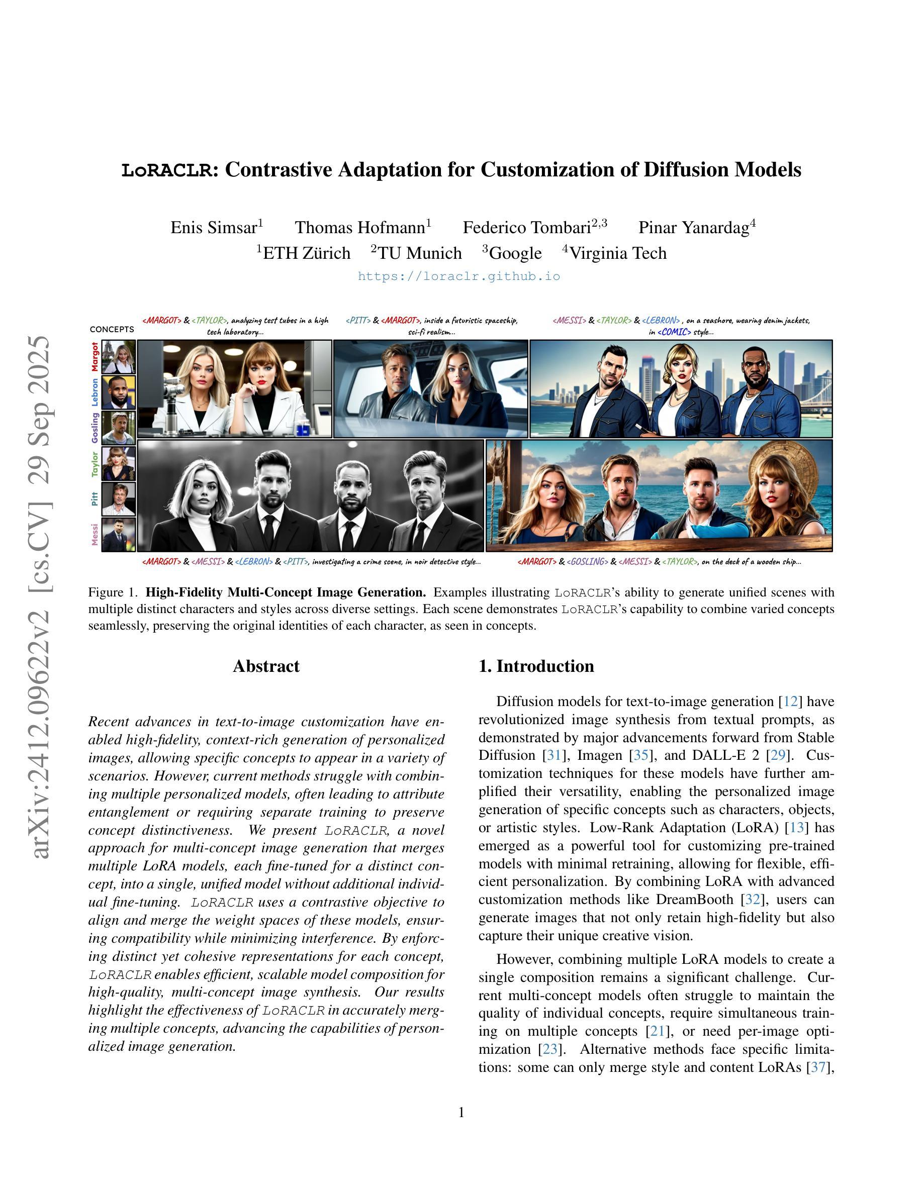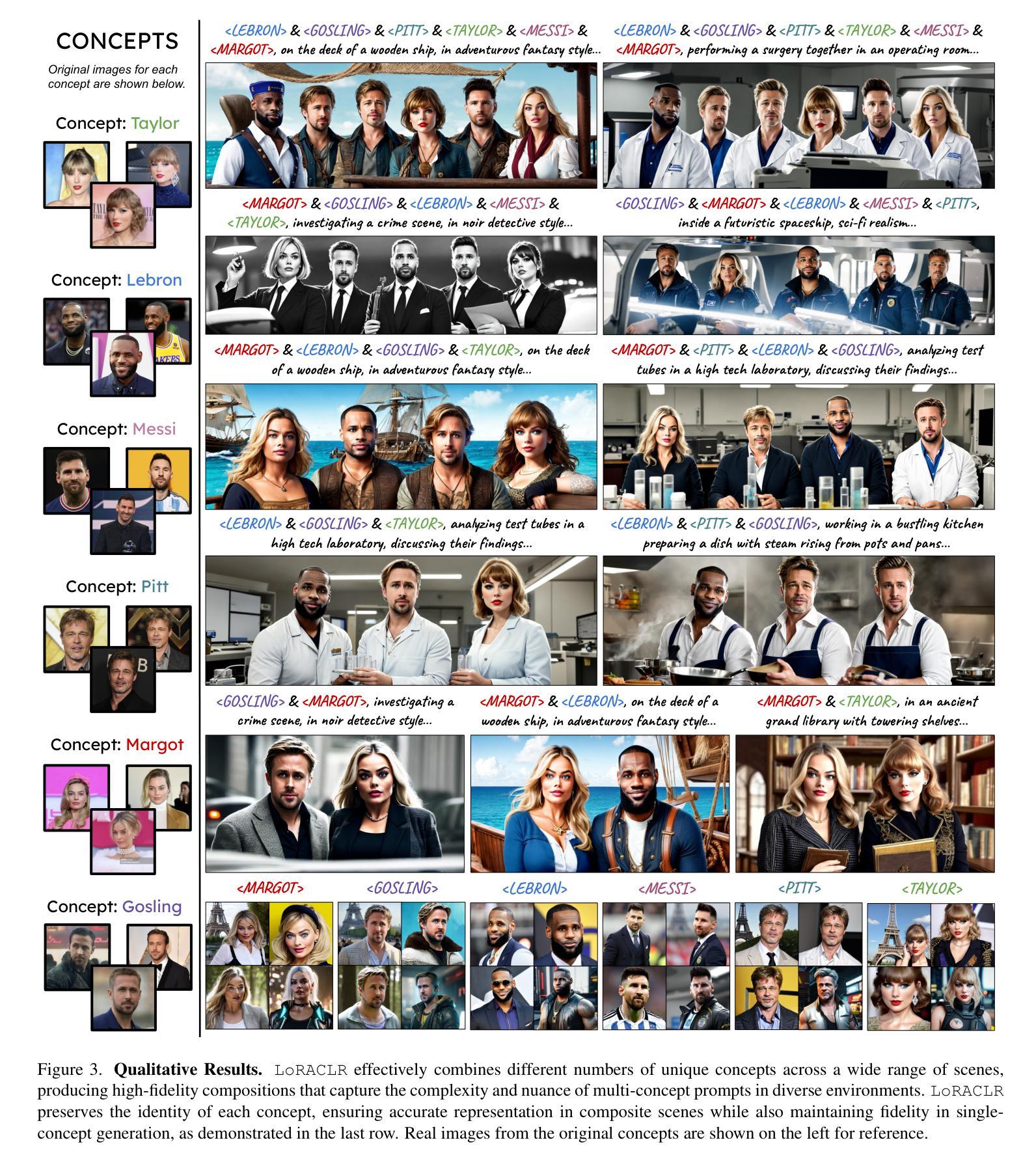 文本到图像的定制技术的最新进展已经实现了高保真、富含语境的个性化图像生成,允许特定概念出现在多种场景中。然而,当前的方法在结合多个个性化模型时遇到了困难,经常导致属性纠缠,或者需要单独的培训来保持概念的独特性。我们提出了LoRACLR,这是一种新的多概念图像生成方法,它将多个针对特定概念进行微调LoRA模型合并为一个单一、统一的模型,而无需额外的个别微调。LoRACLR使用对比目标来对齐和合并这些模型的权重空间,确保兼容性同时最小化干扰。通过实施清晰而连贯的表示,每个概念都有自己的特点,LoRACLR能够实现高效、可扩展的模型组合,用于高质量的多概念图像合成。我们的结果突出了LoRACLR在准确合并多个概念方面的有效性,提高了个性化图像生成的能力。