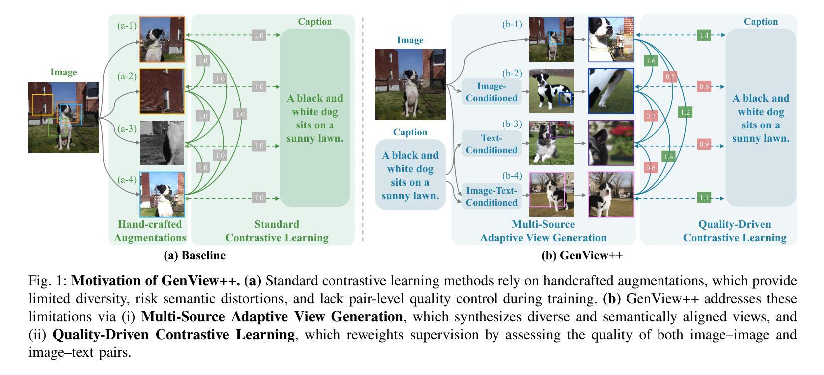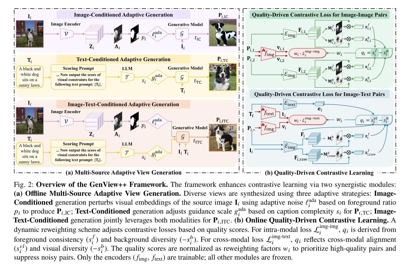 对比学习的成功取决于高质量正对的构建和利用。然而,当前的方法在两个方面都面临着关键的局限性:在构建方面,手工制作和生成式增强通常受限于有限的多样性,并存在语义损坏的风险;在学习方面,由于缺乏质量评估机制,所有对都被平等对待,导致监督效果不佳。为了解决这些挑战,我们提出了GenView++,这是一个通过引入两项协同创新来解决这些问题的统一框架。为提高配对构建,GenView++引入了一种多源自适应视图生成机制,通过动态调制图像条件、文本条件和图像文本混合条件下的生成参数,合成多样但语义连贯的视图。其次,质量驱动对比学习机制评估每对语义对齐和多样性,以动态调整其训练贡献的权重,优先高质量配对,同时抑制冗余或错位配对。大量实验表明,GenView++在视觉和视觉语言任务中均有效。在视觉表示学习中,它在ImageNet线性分类上提高了MoCov2的性能+2.5%。在视觉语言学习中,与CLIP相比提高了零样本分类平均准确度+12.31%,与SLIP相比提高了+5.31%,跨十个数据集;同时提高了Flickr30k文本检索的R@5指标+3.2%。代码可用在https://github.com/xiaojieli0903/GenViewPlusPlus。