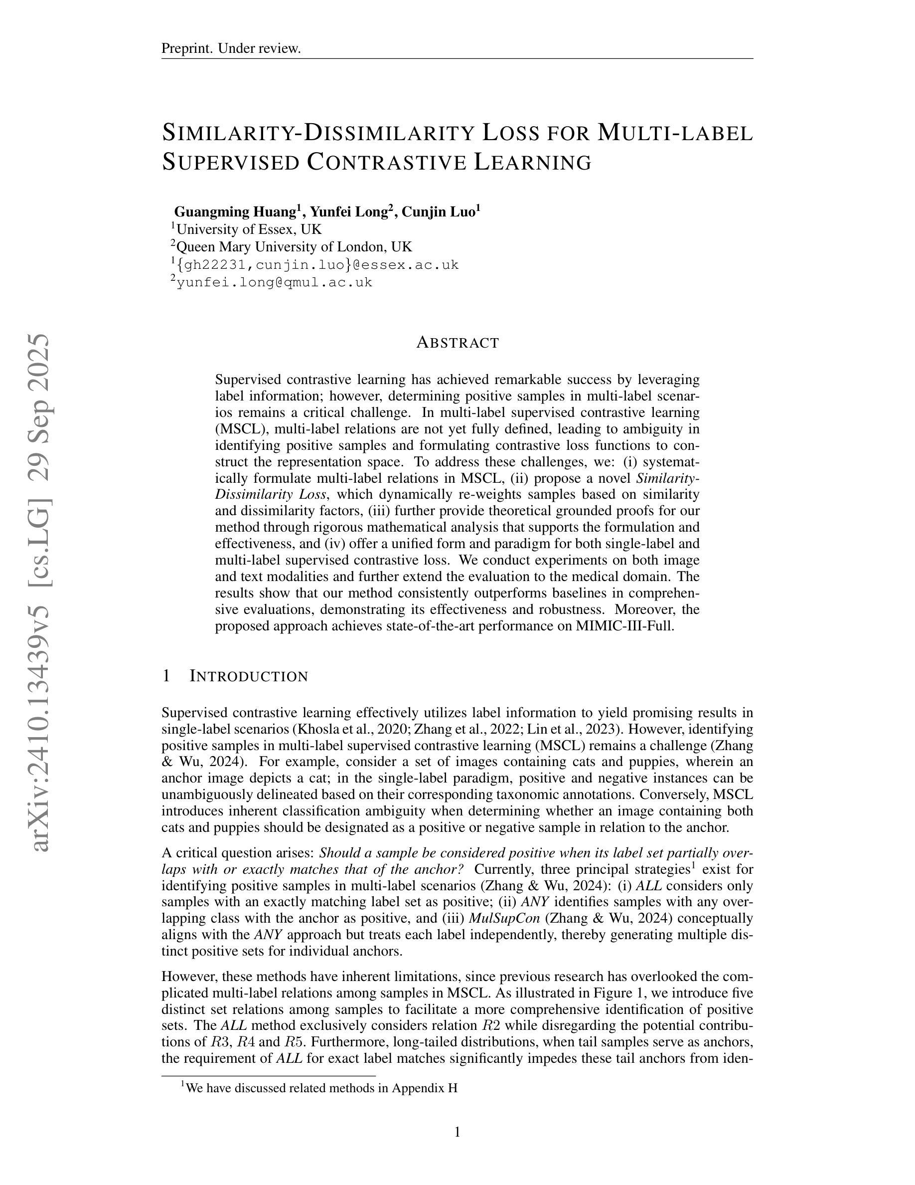 无监督对比学习取得了显著的成功,但在多标签场景中确定正样本是一个挑战。在多标签监督对比学习(MSCL)中,由于多标签关系尚未明确界定,导致难以确定正样本并构建对比损失函数以构建表示空间。为解决这些问题,我们系统地提出了多标签关系的界定、新的相似性-差异性损失函数设计,提供了理论支撑与数学分析证明其有效性,并给出了统一的多标签和单标签监督对比损失范式。实验结果表明,我们的方法在图像和文本模态上的表现均优于基线方法,且在医疗领域的表现尤其突出。我们的方法在MIMIC-III-Full数据集上取得了最优的性能表现。