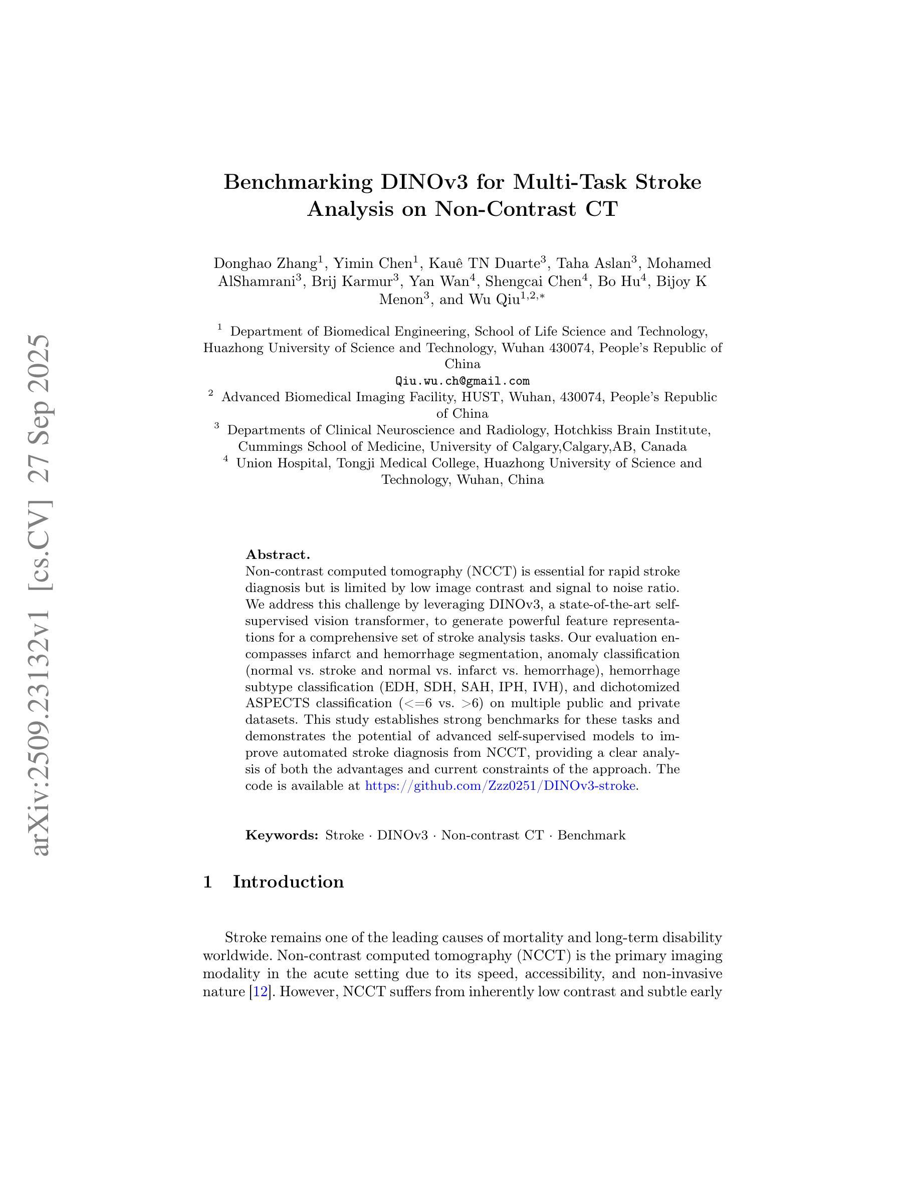 - 先进自监督模型在改善NCCT自动化卒中诊断方面的潜力得到了验证。
