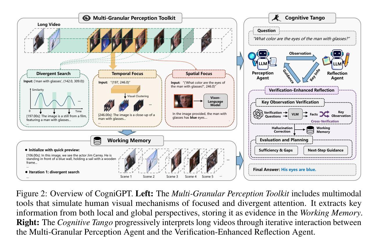 长视频具有时间复杂性和稀疏的任务相关信息,为AI系统带来了重大的推理挑战。尽管基于大型语言模型(LLM)的各种方法已经推动了长视频理解的发展,但它们仍然难以在捕获任务关键信息时同时实现完整性和效率。受人类渐进式视觉认知的启发,我们提出了CogniGPT框架,它利用多粒度感知代理(MGPA)和增强验证反射代理(VERA)之间的交互循环,实现高效可靠的长视频理解。具体来说,MGPA模仿人类的视觉发散和集中注意力来捕获与任务相关的信息,而VERA验证感知到的关键线索,以减轻幻觉并优化随后的感知策略。通过这一交互过程,CogniGPT探索了一组信息丰富且可靠的任务相关线索。在EgoSchema、Video-MME、NExT-QA和MovieChat数据集上的大量实验表明,CogniGPT在准确性和效率方面都表现出卓越的性能。值得注意的是,在EgoSchema上,它仅使用11.2帧超越了现有的无训练方法,并实现了与Gemini 1.5-Pro相当的性能。