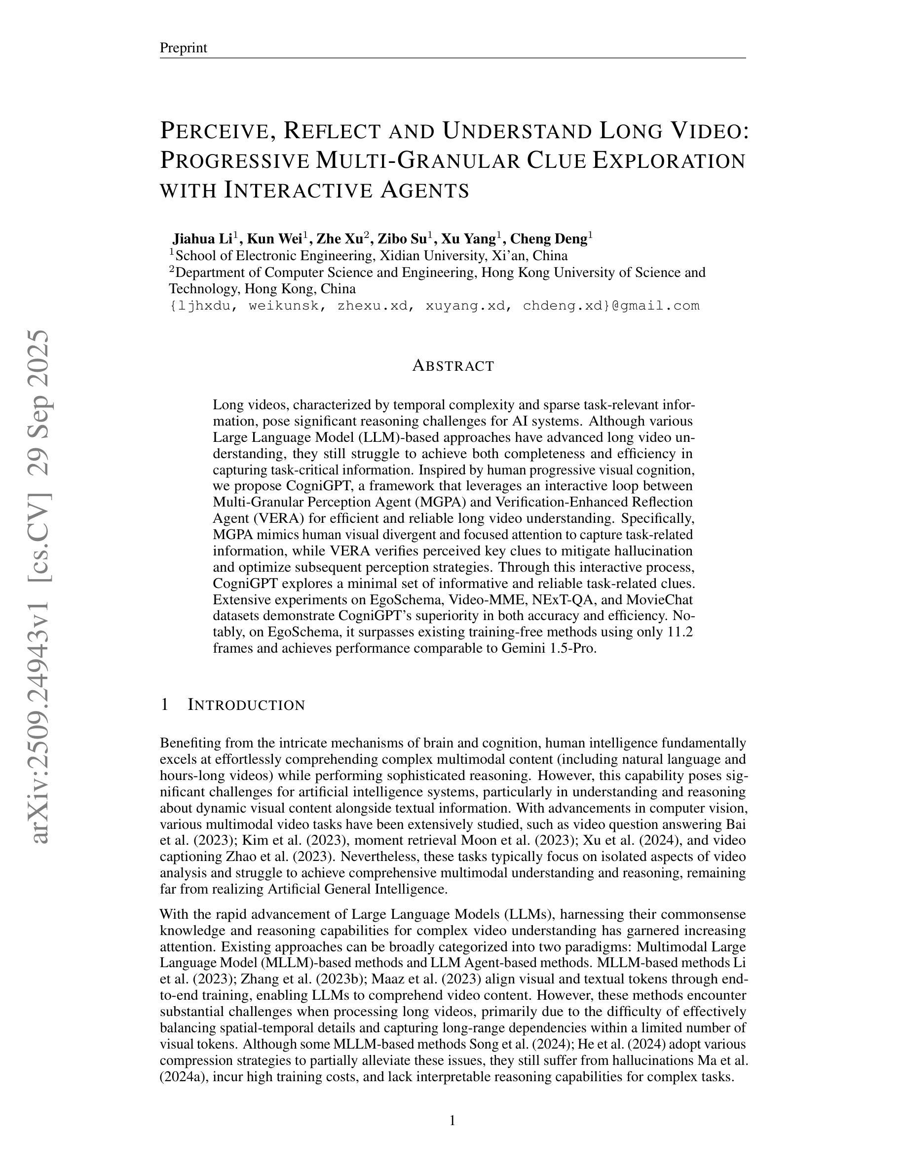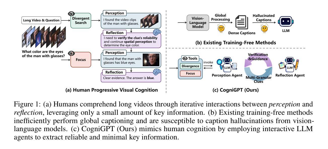 长视频由于时间复杂度高且任务相关信息稀疏,给AI系统带来推理挑战。尽管基于大型语言模型(LLM)的方法已经促进了长视频理解的发展,但它们仍难以在捕捉任务关键信息时同时实现完整性和效率。受人类渐进式视觉认知的启发,我们提出了CogniGPT框架,它通过多粒度感知代理(MGPA)和验证增强反射代理(VERA)之间的交互循环,实现高效可靠的长视频理解。具体来说,MGPA模仿人类的视觉发散和集中注意力来捕捉任务相关信息,而VERA验证感知到的关键线索,以减轻幻觉并优化后续的感知策略。通过这一交互过程,CogniGPT探索了少量信息丰富且可靠的与任务相关的线索。在EgoSchema、Video-MME、NExT-QA和MovieChat数据集上的大量实验表明,CogniGPT在准确性和效率上均表现出卓越的性能。特别是在EgoSchema数据集上,它仅使用11.2帧超越了现有的无训练方法,并实现了与Gemini 1.5-Pro相当的性能。