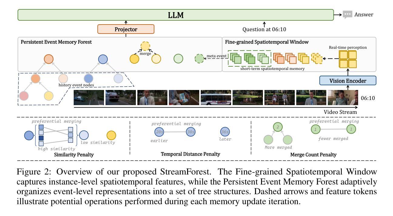 多模态大型语言模型(MLLMs)在视频理解方面最近取得了显著的进步。然而,它们在实时流媒体场景中的有效性仍然有限,主要是由于历史视觉特征的存储约束和实时时空推理的不足。为了解决这些挑战,我们提出了专门用于流媒体视频理解的全新架构StreamForest。StreamForest的核心是持久事件记忆森林(Persistent Event Memory Forest),这是一种记忆机制,能够自适应地将视频帧组织成多个事件级别的树结构。这一过程由基于时间距离、内容相似性和合并频率的惩罚函数引导,能够在有限的计算资源下实现高效的长效记忆保留。为了提高实时感知能力,我们引入了精细时空窗口(Fine-grained Spatiotemporal Window),它捕捉短期视觉线索,以提高对当前场景的感知。此外,我们还推出了OnlineIT,这是一个专为流媒体视频任务定制的指令调整数据集。OnlineIT显著提升了MLLM在实时感知和未来预测方面的性能。为了评估在实际应用中的泛化能力,我们引入了ODV-Bench,这是一个专注于自动驾驶场景中实时流媒体视频理解的新基准测试。实验结果表明,StreamForest达到了最先进的性能,在StreamingBench上的准确率为77.3%,在OVBench上为60.5%,在OVO-Bench上为55.6%。即使在极端视觉令牌压缩(限制为1024个令牌)下,该模型在八个基准测试中的平均准确率仍保持在默认设置的96.8%。这些结果证明了StreamForest在流媒体视频理解方面的稳健性、效率和泛化能力。