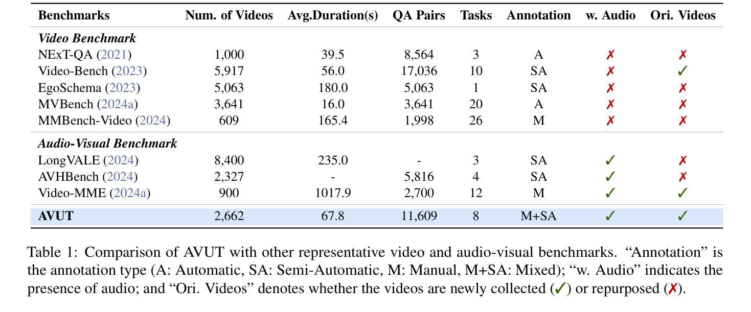 - 论文提出了一种新的视频理解基准测试(AVUT),专注于评估多模态大型语言模型对音频信息的理解能力。