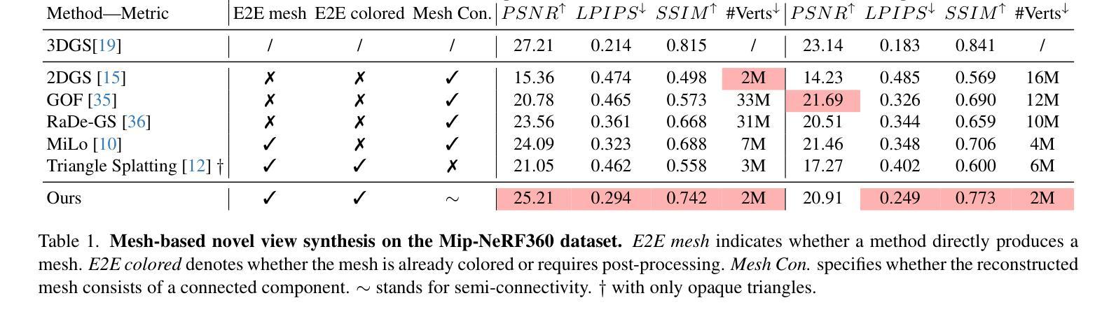 重建三维场景和合成新颖视角的技术近年来取得了快速发展。神经辐射场(Neural Radiance Fields)证明了连续体积辐射场可以实现高质量图像合成,但其较长的训练和渲染时间限制了其实用性。三维高斯贴片(3DGS)通过用数百万个高斯函数表示场景解决了这些问题,实现了实时渲染和快速优化。然而,高斯基本实体与虚拟现实头盔和实时图形应用程序中使用的基于网格的管道原生不兼容。现有解决方案尝试通过后期处理或两阶段管道将高斯转换为网格,这增加了复杂性并降低了视觉质量。在这项工作中,我们引入了三角形贴片+(Triangle Splatting+),它直接在可微分的贴片框架内优化计算机图形的基本原始实体——三角形。我们制定三角形参数化,以通过共享顶点实现连接,并设计一种训练策略来强制执行不透明三角形。最终输出可立即在标准图形引擎中使用,无需后期处理。在Mip-NeRF360和Tanks & Temples数据集上的实验表明,三角形贴片+在基于网格的新颖视图合成中达到了最先进的性能。我们的方法在视觉保真度上超越了先前的贴片方法,同时保持了高效和快速的训练。此外,所得的半连接网格支持下游应用,如基于物理的模拟或交互式漫游。项目页面是https://trianglesplatting2.github.io/trianglesplatting2/。