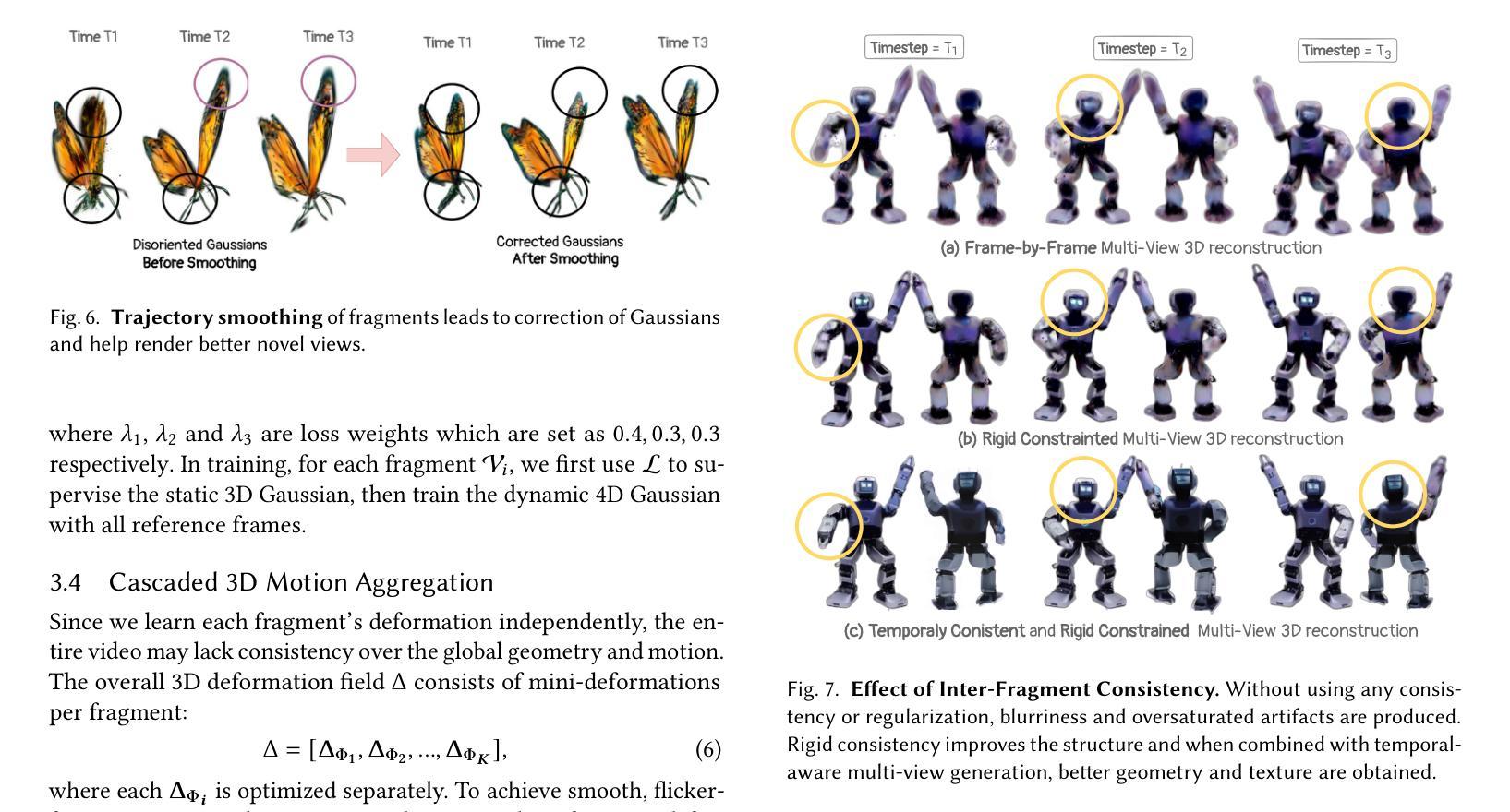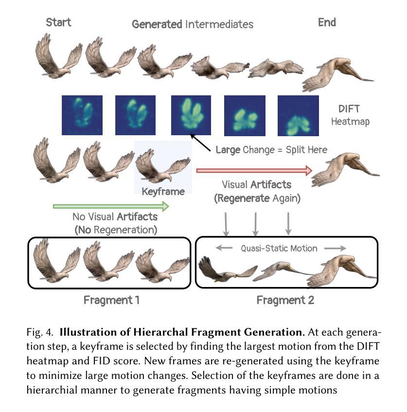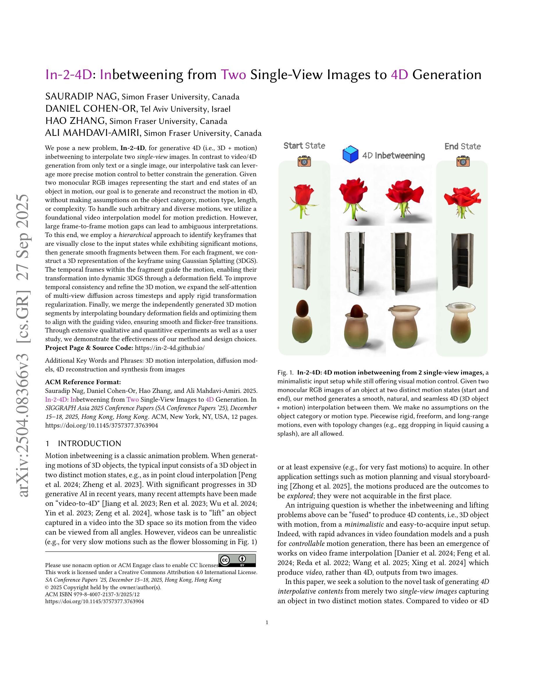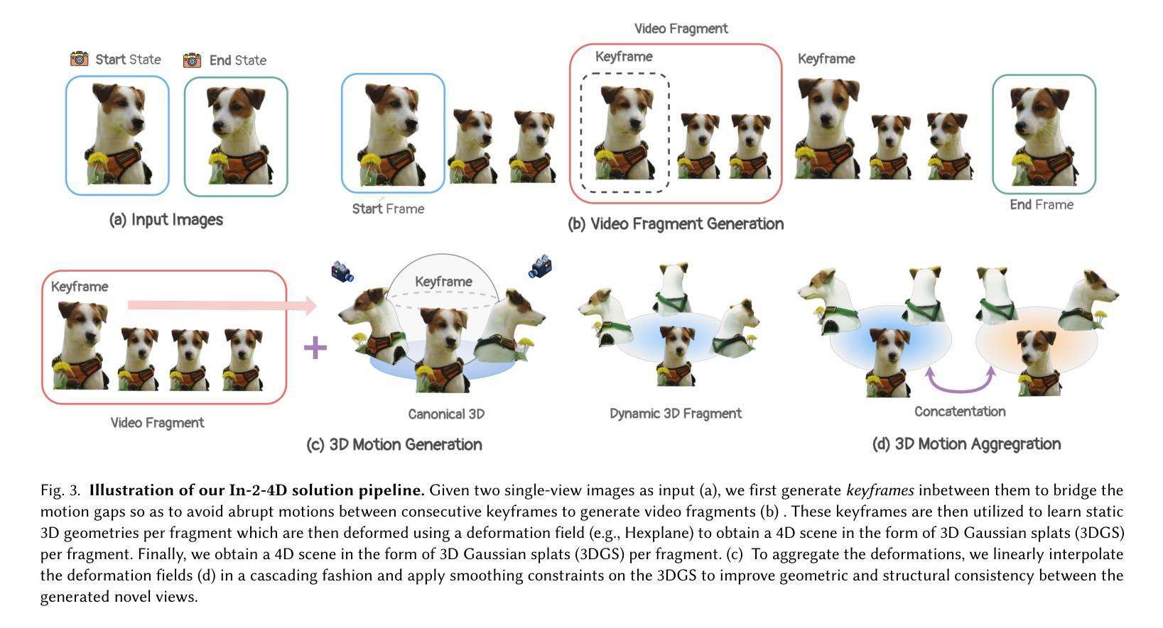 本文提出一个新的生成问题,即In-2-4D问题,用于在二维图像之间进行四维(即三维加运动)插值。本文的目标是在给定的两个表示物体运动起始和结束状态的单视图图像之间生成和重建四维运动,无需假设物体类别、运动类型、长度或复杂性。通过采用分层方法识别视觉上接近输入状态且运动显著的关键帧,然后在它们之间生成平滑片段,并使用高斯拼贴技术(3DGS)构建每个片段的3D表示。时间帧指导运动,将其转化为动态3DGS。通过扩展跨时间步的多视图扩散的自注意力并应用刚性变换正则化,提高时间一致性和改进3D运动。最后,通过插值边界变形场并进行优化与指导视频对齐,确保平滑且无闪烁的过渡。通过定性和定量实验以及用户研究证明了方法的有效性。