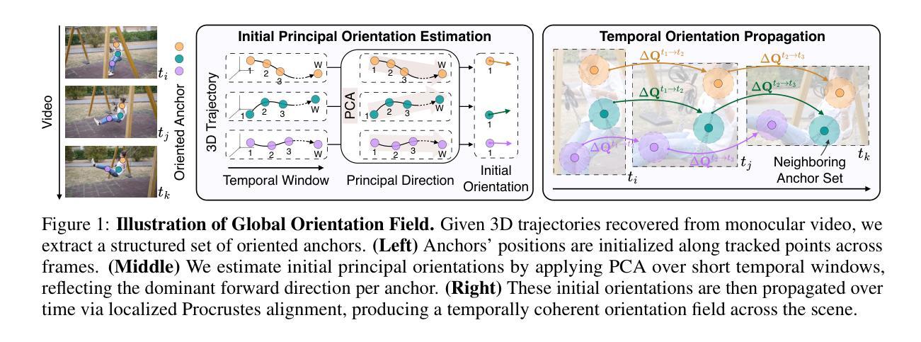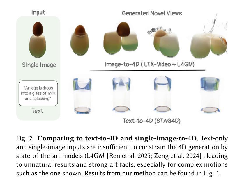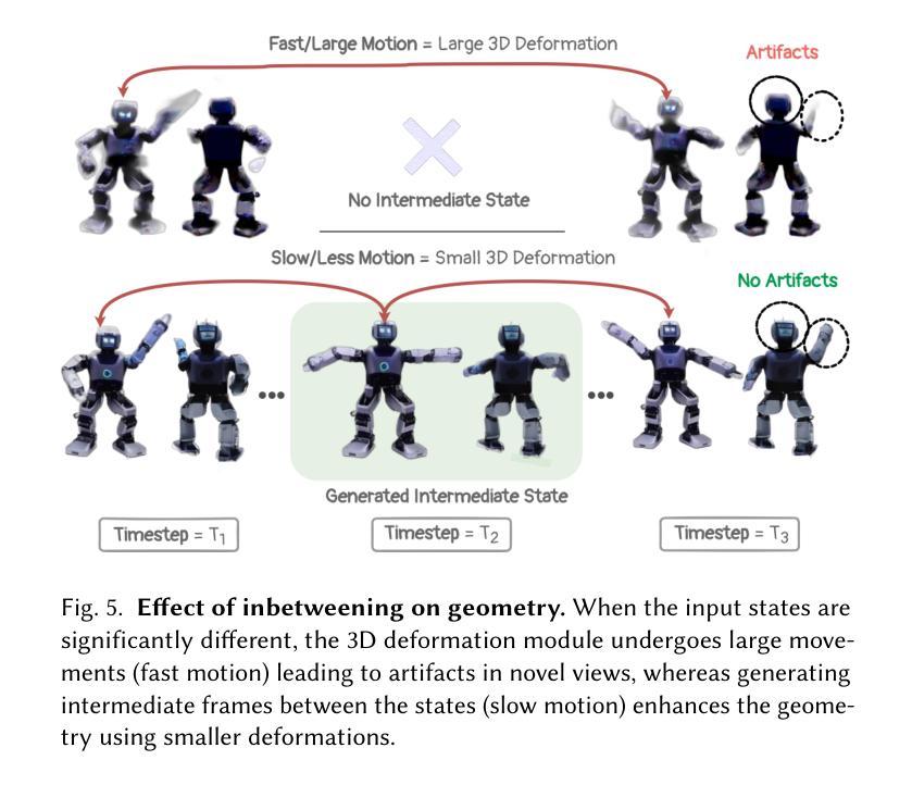 我们针对生成式4D(即3D+运动)插值提出一个新问题,即In-2-4D,用以插值两个单视图图像。与仅从文本或单幅图像生成视频/4D内容不同,我们的插值任务可以利用更精确的运动控制来更好地约束生成。给定两个表示运动物体起始和结束状态的单目RGB图像,我们的目标是生成和重建4D中的运动,而不对物体类别、运动类型、长度或复杂性做出假设。为了处理这种任意和多样的运动,我们采用基础视频插值模型进行运动预测。然而,帧到帧的运动间隙过大可能会导致解释模糊。为此,我们采用分层方法识别视觉上接近输入状态且运动显著的关键帧,然后在它们之间生成平滑片段。对于每个片段,我们使用高斯拼贴(3DGS)构建关键帧的3D表示。片段内的临时帧指导运动,通过变形场将其转换为动态3DGS。为了提高时间一致性和优化3D运动,我们扩大了跨时间步的多视图扩散的自注意力,并应用了刚性变换正则化。最后,我们通过插值边界变形场并对其进行优化以与指导视频对齐,合并独立生成的3D运动片段,确保平滑无闪烁的过渡。通过广泛的定性和定量实验以及用户研究,我们验证了我们的方法和设计选择的有效性。