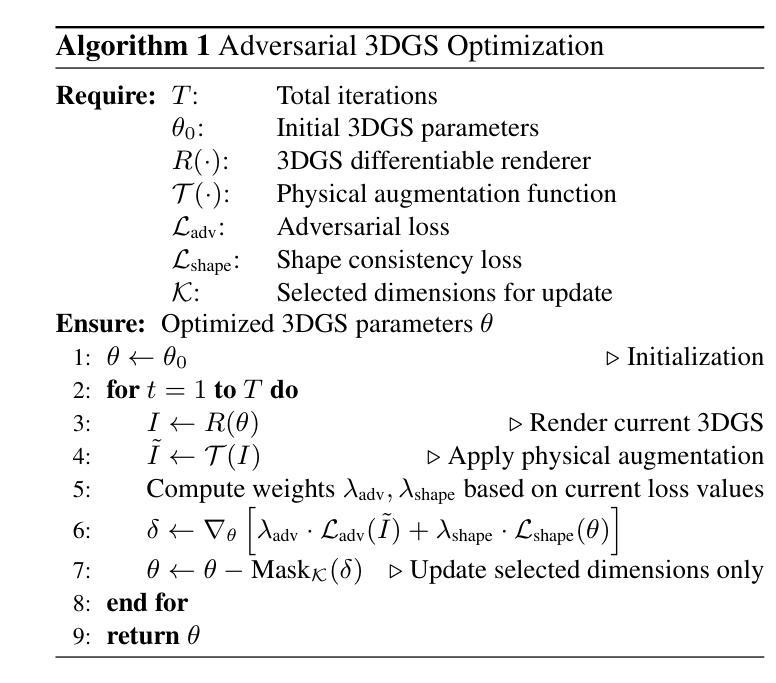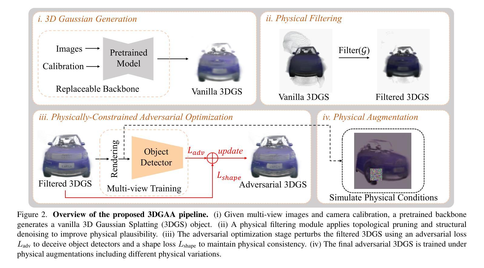 基于摄像头的物体检测系统对于自动驾驶至关重要,但在真实世界环境中,它们仍然容易受到对抗性威胁的影响。现有的二维和三维物理攻击由于侧重于纹理优化,在平衡物理真实性和攻击稳健性方面往往面临挑战。在这项工作中,我们提出了基于三维高斯的对抗攻击(3DGAA),这是一种新型的对抗性物体生成框架,它利用三维高斯模糊(3DGS)的完整的14维参数化,以物理可实现的方式联合优化几何和外观。与以往依赖补丁或纹理优化的工作不同,3DGAA联合扰动几何属性(形状、尺度、旋转)和外观属性(颜色、透明度),以产生物理真实性和可转移性的对抗性物体。我们还进一步引入了一个物理滤波模块,用于过滤异常值以保持几何保真度,以及一个物理增强模块,用于模拟复杂的物理场景,以增强在现实条件下的攻击通用性。我们在虚拟基准测试和物理环境设置中都使用了微型车辆模型来评估3DGAA。实验结果表明,3DGAA将检测mAP从87.21%降低到7.38%,显著优于现有的三维物理攻击。此外,我们的方法在不同的物理条件下保持了高可转移性,在物理可实现的对抗攻击中达到了最新水平。