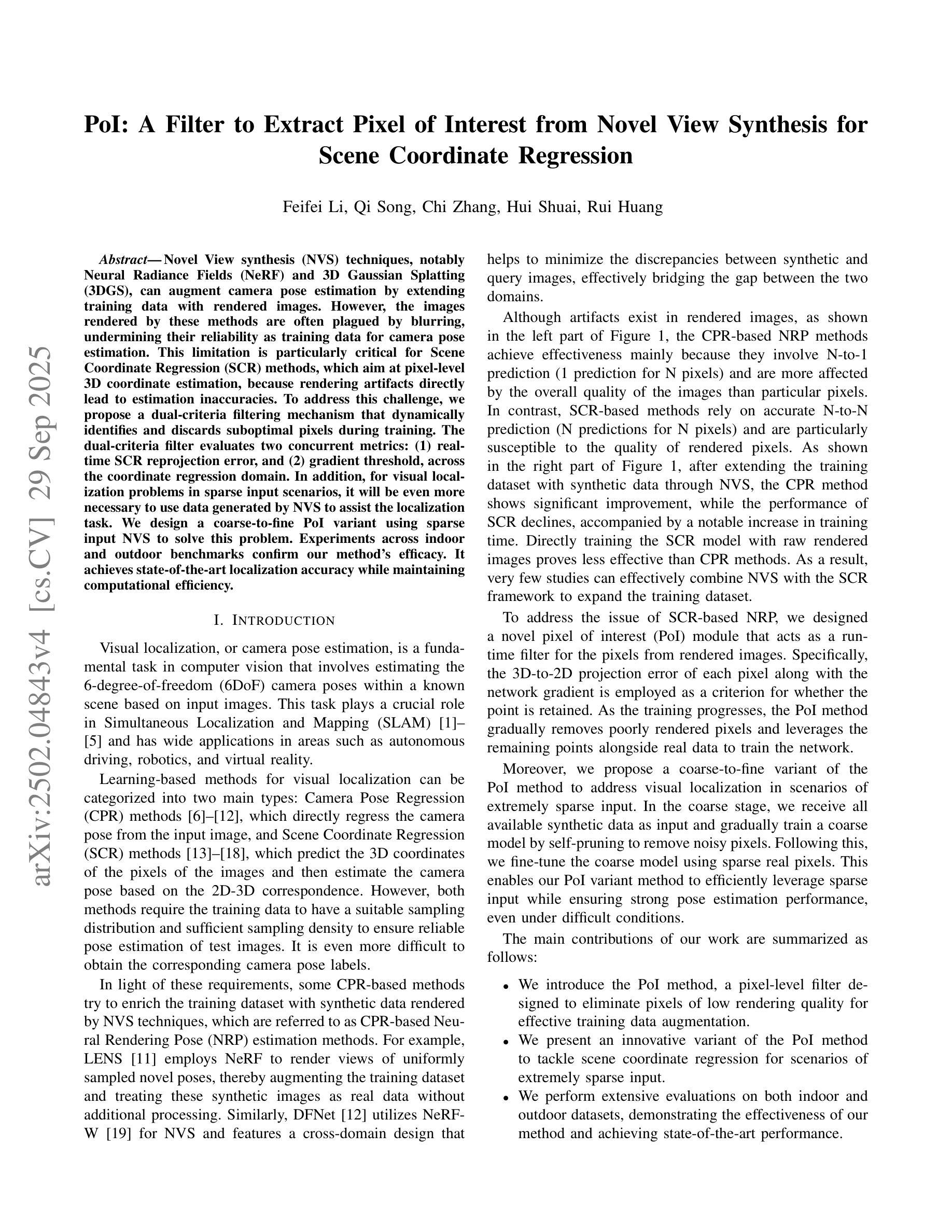 新型视图合成(NVS)技术,特别是神经辐射场(NeRF)和3D高斯喷射(3DGS),可以通过使用渲染图像扩展训练数据来增强相机姿态估计。然而,这些方法呈现的渲染图像常常受到模糊的影响,这使得它们作为相机姿态估计的训练数据的可靠性降低。这一局限性对于场景坐标回归(SCR)方法尤为重要,因为SCR方法旨在进行像素级的3D坐标估计,渲染伪影直接导致估计不准确。为了应对这一挑战,我们提出了一种双标准过滤机制,该机制在训练过程中动态识别并丢弃次优像素。双标准过滤器评估两个并行指标:(1)实时SCR重投影误差和(2)坐标回归域内的梯度阈值。此外,在稀疏输入的视觉定位问题中,使用NVS生成的数据辅助定位任务将变得更加必要。我们设计了一种使用稀疏输入NVS的由粗到细的PoI变体来解决这个问题。室内和室外基准测试的实验结果证实了我们的方法的有效性。它在保持计算效率的同时实现了最先进的定位精度。