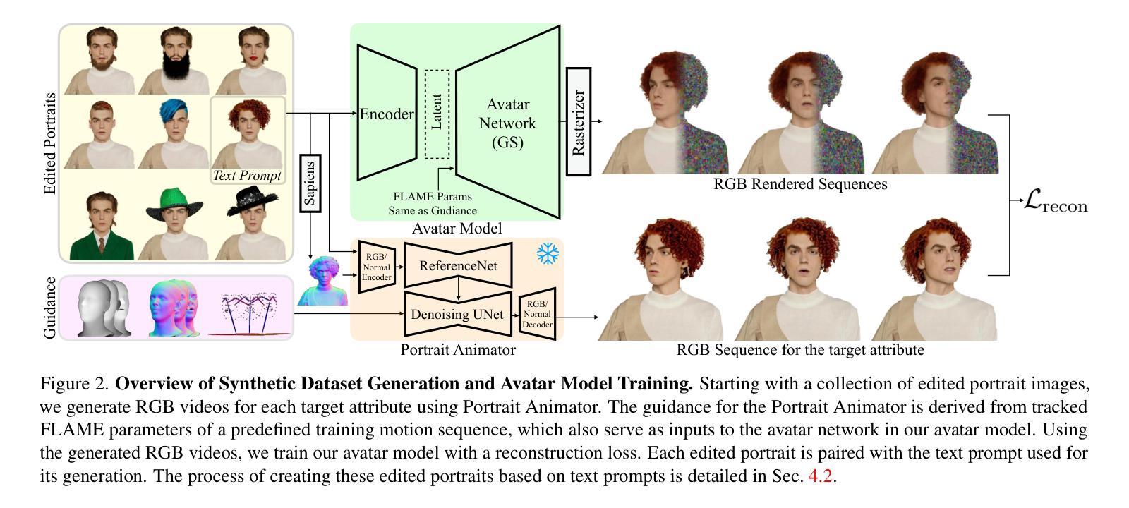 - 利用合成属性数据集,采用基于3D高斯拼贴的方法创建个性化头像。