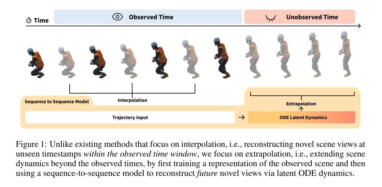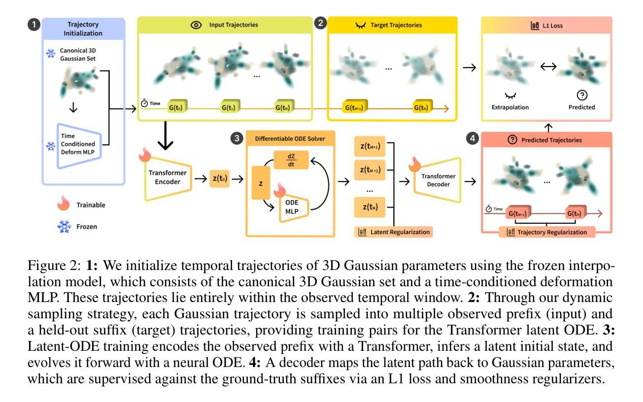 - ODE-GS结合了3D高斯融合与潜在神经常微分方程(ODEs),实现了动态场景的外推预测。