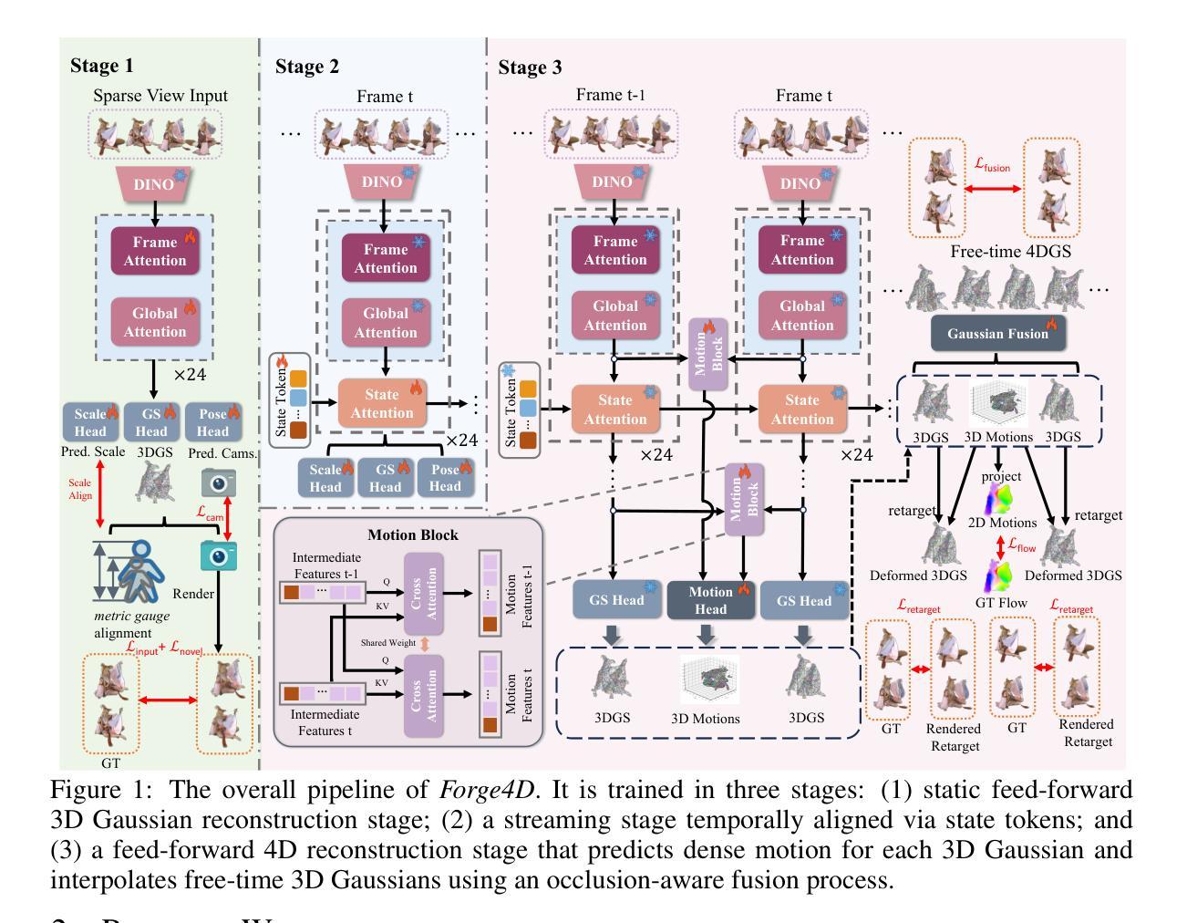 从未校准的稀疏视角视频即时重建动态3D人体对于许多下游应用至关重要。然而,现有方法要么重建速度慢,要么无法生成新颖的时间表示。为了解决这些挑战,我们提出了Forge4D,一个前馈的4D人体重建和插值模型,它可以从未校准的稀疏视角视频有效地重建时间对齐的表示,从而实现新颖视图和新颖时间的合成。我们的模型将4D重建和插值问题简化为流式3D高斯重建和密集运动预测的共同任务。对于流式3D高斯重建任务,我们首先从未校准的稀疏视角图像重建静态3D高斯,然后引入可学习的状态令牌,以交互方式更新不同时间戳之间的共享信息,以内存友好的方式强制执行时间一致性。对于新颖的时间合成,我们设计了一个新颖的运动预测模块,用于预测相邻两帧之间每个3D高斯密集运动,结合一个遮挡感知的高斯融合过程,以在任意时间戳插值3D高斯。为了克服缺乏密集运动监督的地面真实数据,我们将密集运动预测制定为密集点匹配任务,并引入自监督重定位损失来优化此模块。还引入了额外的遮挡感知光流损失,以确保与合理的人类运动一致的运动一致性,提供更强的正则化。大量实验表明,我们的模型在域内和域外数据集上均有效。项目页面和代码地址为:https://zhenliuzju.github.io/huyingdong/Forge4D。