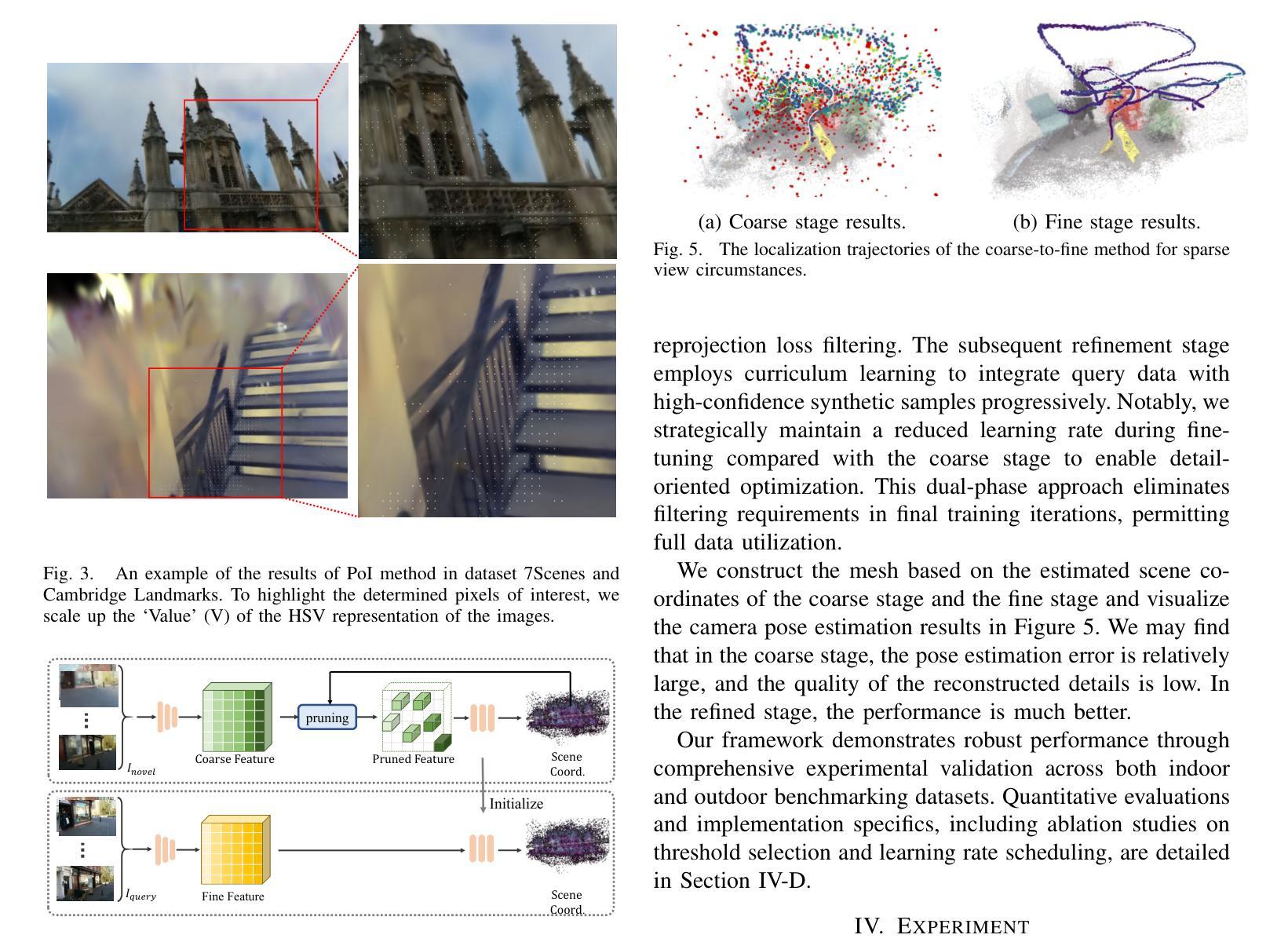 NeRF和3DGS等新型视图合成技术可以通过生成渲染图像来扩充训练数据,从而提升相机姿态估计的准确度。然而,这些技术生成的图像常常存在模糊问题,这会对作为相机姿态估计训练数据的可靠性造成影响。针对这一问题,文章提出了一种基于双重标准的过滤机制,该机制能在训练过程中动态识别并剔除表现不佳的像素点。双重标准过滤器同时评估实时场景坐标回归重投影误差和梯度阈值两个指标,以提高坐标回归领域的估计精度。此外,对于稀疏输入情况下的视觉定位问题,使用新型视图合成技术辅助定位任务尤为必要。设计了一种基于稀疏输入的粗到细的PoI变体方法来解决这一问题,并在室内和室外基准测试上进行了实验验证,该方法在计算效率的同时实现了最先进的定位精度。