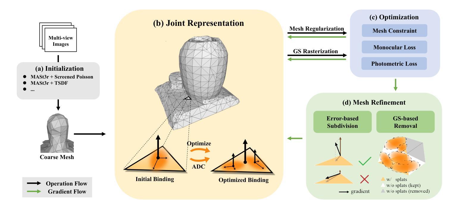 神经渲染与高斯平铺技术已经推动了新型视图合成的进步,大多数方法通过事后网格提取进行表面重建。然而,现有方法存在两个局限性:(i)在纹理较少的室内区域几何形状不准确;(ii)网格提取与优化之间的解耦,从而失去了利用网格几何来引导平铺优化的机会。在本文中,我们介绍了OMeGa,这是一个端到端的框架,它通过灵活的绑定策略联合优化明确的三角形网格和二维高斯平铺,其中高斯平铺的空间属性在网格框架中表示,纹理属性保留在平铺上。为了进一步提高重建精度,我们将网格约束和单目法线监督集成到优化中,从而规范几何学习。此外,我们提出了一种启发式迭代网格细化策略,分裂高误差面并删除不可靠的面,以进一步提高重建网格的细节和准确性。OMeGa在具有挑战性的室内重建基准测试中实现了最先进的性能,在保持竞争力新颖视图渲染质量的同时,相对于二维高斯平铺基线减少了Chamfer-$L_1$的误差百分比达47.3%。实验结果证明,OMeGa有效地解决了先前在室内无纹理重建中的局限性。