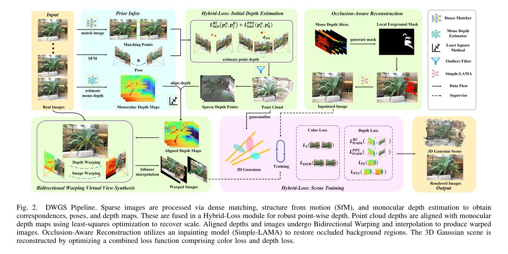 - DWGS框架通过集成结构线索、虚拟视图约束和遮挡区域完成技术,增强了3DGS在稀疏视图合成中的性能。