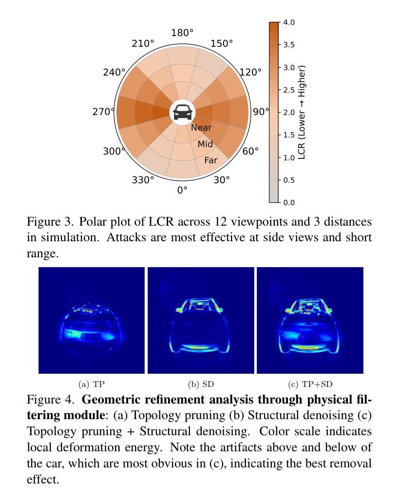 五、实验验证:在虚拟基准和物理环境设置中的评估显示,3DGAA显著降低了物体检测精度,并表现出优秀的跨物理条件可转移性。