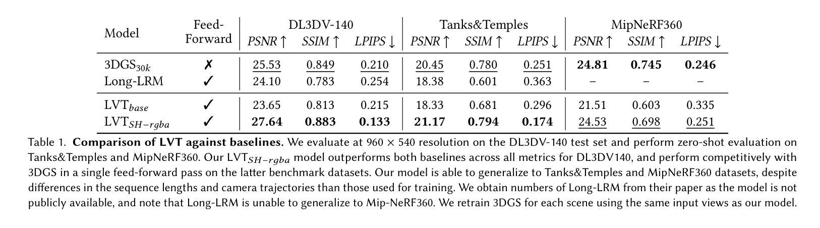 大型Transformer模型被证明是3D视觉和新型视角合成的强大工具。然而,标准Transformer众所周知的二次复杂度使得将这些方法扩展到大型场景变得困难。为了应对这一挑战,我们提出了局部视图Transformer(LVT),这是一种大规模场景重建和新型视角合成架构,它避免了二次注意力操作的需要。我们的见解是,空间上的邻近视图提供了关于局部场景组成的更有用的信号,而不是远处的视图。我们的模型处理每个视图周围局部区域的所有信息。为了关注邻近视图的标记,我们利用了一种新型的位置编码,该编码以查询和邻近视图之间的相对几何变换为条件。我们将模型的输出解码为3D高斯Splat场景表示,其中包括颜色和透明度视差依赖性。综上所述,局部视图Transformer能够在单次前向传递中进行任意大小、高分辨率场景的重建。有关结果和交互演示,请访问我们的项目页面:https://toobaimt.github.io/lvt/。