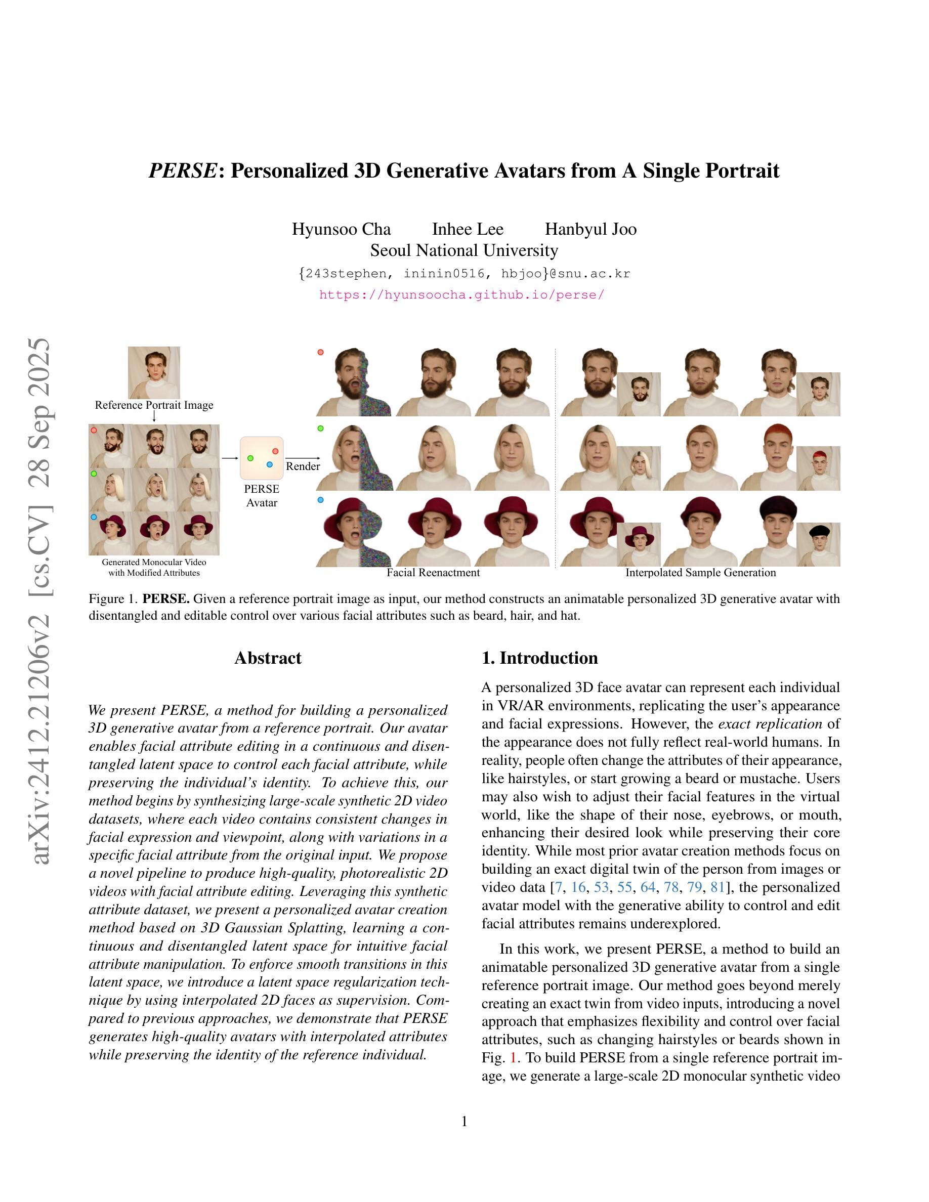 该项目提出了一种基于参考肖像构建个性化3D生成头像的方法PERSE。该方法能够在连续的、分离的潜在空间中对头像的面部属性进行编辑,同时保持个体身份的识别。它通过合成大规模二维视频数据集开始,每个视频包含面部表情和视角的一致变化,以及来自原始输入的特定面部属性的变化。基于此合成属性数据集,研究提出了一种基于3D高斯拼贴的个人化头像创建方法,学习一个连续的、分离的潜在空间以进行直观的面部属性操作。通过插值二维面孔作为监督引入潜在空间的正则化技术,以确保在此潜在空间中实现平滑过渡。与以前的方法相比,PERSE生成的头像质量更高,属性插值自然,同时保持了参考个体的身份。