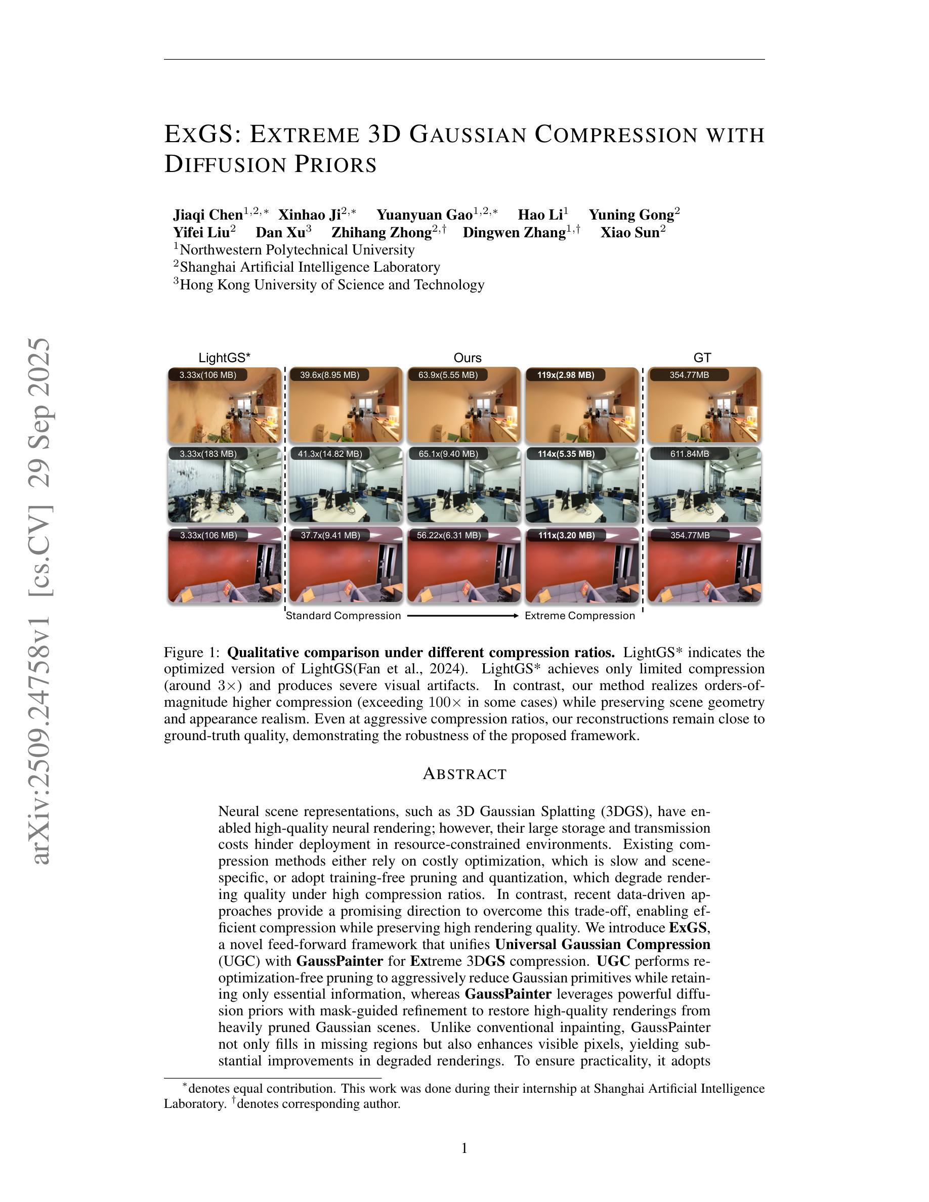 基于神经网络场景表示(如3DGS)的高质量神经渲染已经实现,但其存储和传输成本较高,不适用于资源受限的环境。现有压缩方法存在优化成本高或压缩质量下降的问题。本文提出一种新颖的前馈框架ExGS,结合通用高斯压缩(UGC)与GaussPainter技术实现极端3DGS压缩,可在保留重要信息的同时进行大幅度的高斯原始数据缩减,并利用扩散先验与掩膜导向的细化技术恢复高质量渲染。ExGS实现了超过$100\times$的压缩率,同时在具有挑战性的条件下保持了保真度和图像质量的显著提高。代码库已发布在https://github.com/chenttt2001/ExGS。