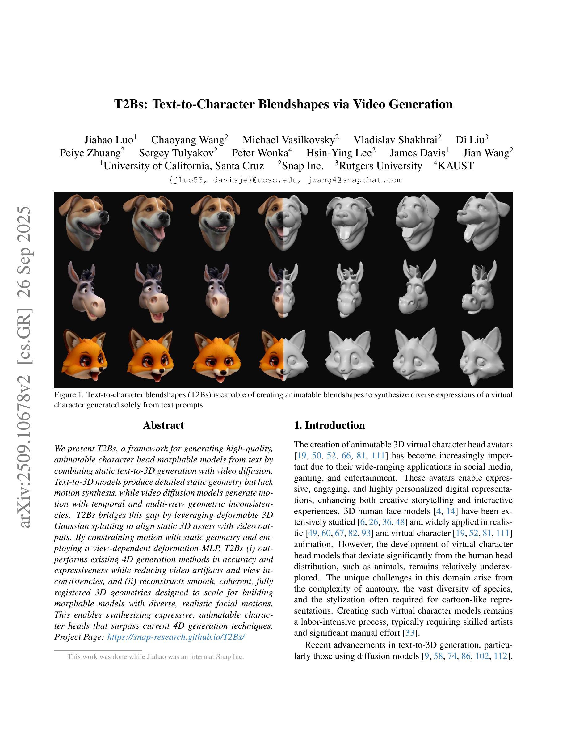 我们提出了T2Bs框架,它通过结合静态文本到3D生成和视频扩散技术,从文本生成高质量的可动画角色头部可变形模型。文本到3D模型可以生成详细的静态几何结构,但缺乏运动合成,而视频扩散模型虽然可以生成运动,但存在时间和多视角几何不一致的问题。T2Bs通过利用可变形3D高斯贴图技术,将静态3D资产与视频输出对齐,从而弥补了这一空白。通过用静态几何结构约束运动并采用视角相关变形多层感知器,T2Bs(i)在准确性和表现力方面优于现有的4D生成方法,同时减少了视频伪影和视角不一致问题;(ii)重建了平滑、连贯、完全配准的3D几何结构,旨在构建具有多样化和现实感的面部运动的可变形模型。这能够合成出超越当前4D生成技术的生动可动画角色头部。