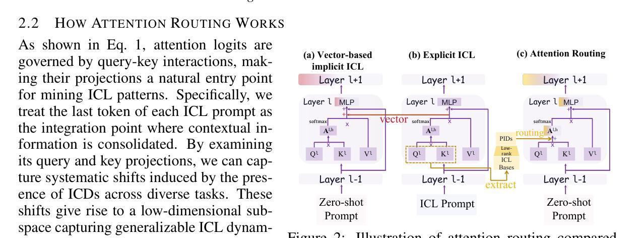 隐式上下文学习(ICL)作为一种新兴的有前途的范式,模拟了大型语言模型(LLM)的表示空间中的ICL行为,旨在以零成本达到小样本性能。然而,现有方法大多依赖于向残差流注入迁移向量,这通常是由带标签的演示或任务特定的对齐构建的。这种设计未能充分利用ICL的内在结构机制,且其通用性有限。为了解决这个问题,我们提出了上下文路由(ICR),这是一种新型的隐式ICL方法,在注意力得分层面内部化可泛化的ICL模式。它提取了在ICL过程中出现的可重复使用的结构方向,并采用可学习的输入条件路由器来相应地调整注意力得分,从而实现了一次训练、多次复用的框架。我们在涵盖多个领域和多种大型语言模型的12个真实世界数据集上评估了ICR。结果表明,ICR持续优于先前需要任务特定检索或训练的隐式ICL方法,同时在现有方法表现挣扎的跨域任务中表现出稳健的泛化能力。这些发现确立了ICR在推动ICL实用价值方面的地位。