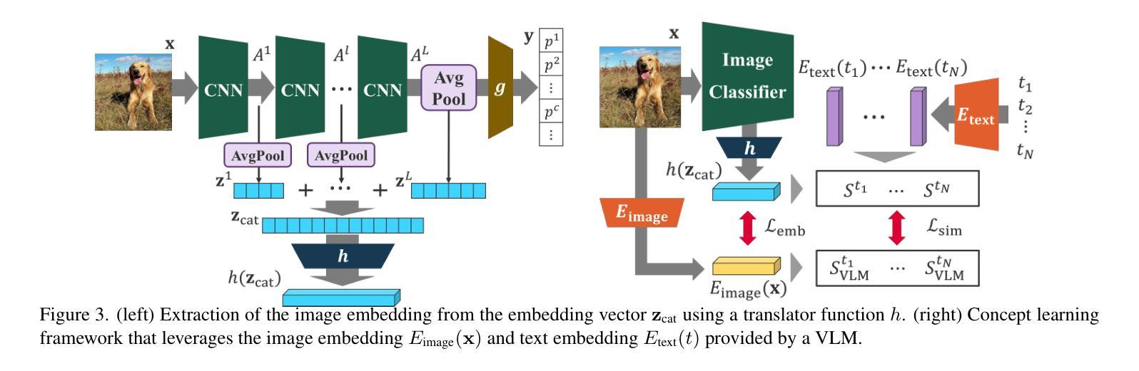 本文提出了一种基于概念的解释方法CE-FAM,用于揭示图像分类器学习的概念、图像中的相关区域以及这些概念对预测的贡献。该方法利用分支网络共享激活图,并模仿视觉语言模型(VLM)的嵌入,预测图像中的概念及其对应区域。分支网络通过加权和激活图表示这些区域,权重由概念预测分数的梯度给出。此外,本文还引入了一种新的评估指标来评估概念区域的准确性。该方法在未见过的概念上实现了零样本推理的优异表现。