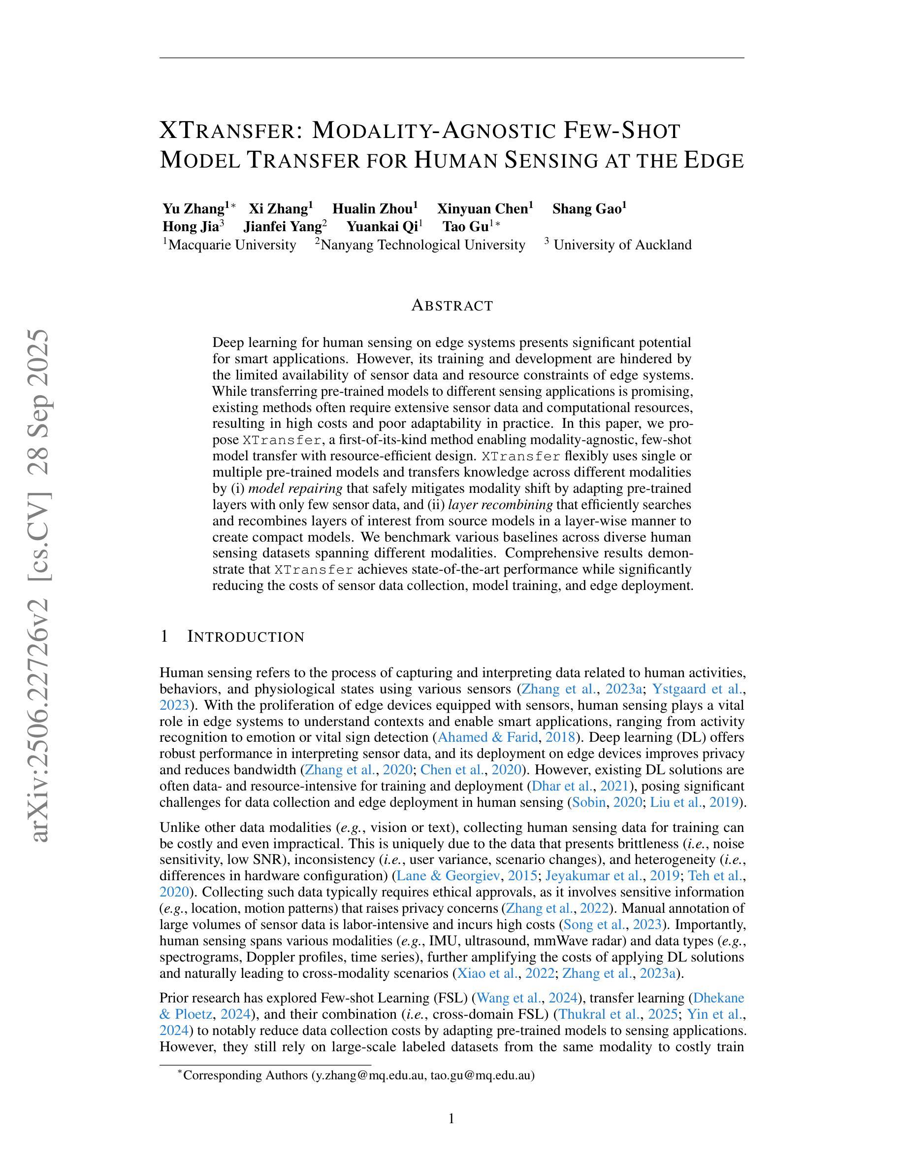 深度学习在边缘系统上进行人体感知具有巨大的智能应用潜力。然而,其训练和开发受到传感器数据有限和边缘系统资源限制的阻碍。虽然将预训练模型转移到不同的感知应用中前景广阔,但现有方法通常需要大量的传感器数据和计算资源,导致实践中的成本高昂和适应性差。在本文中,我们提出了XTransfer,这是一种新型的方法,能够实现模态无关的、少样本模型转移并具有资源高效的设计。XTransfer可以灵活地使用单个或多个预训练模型,并通过(i)模型修复来安全地减轻模态偏移,仅使用少量传感器数据适应预训练层;(ii)层重组有效地逐层搜索和重组源模型的感兴趣层以创建紧凑模型。我们在跨越不同模态的多样化人体感知数据集上对各种基线进行了基准测试。综合结果表明,XTransfer在达到最新性能的同时,大大降低了传感器数据采集、模型训练和边缘部署的成本。