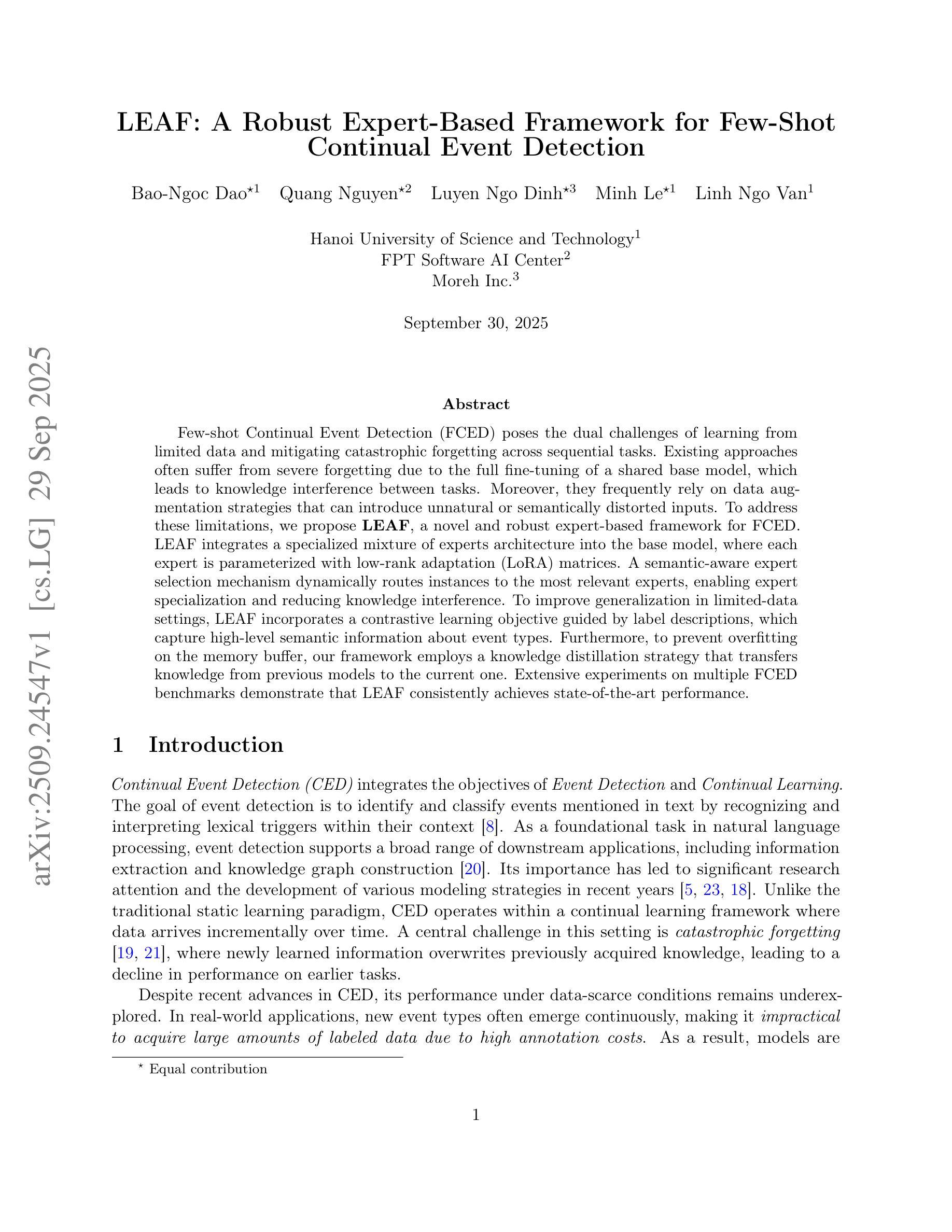 - LEAF是一个针对Few-Shot Continual Event Detection(FCED)的新型专家框架,旨在解决有限数据学习和任务连续性中的灾难性遗忘问题。