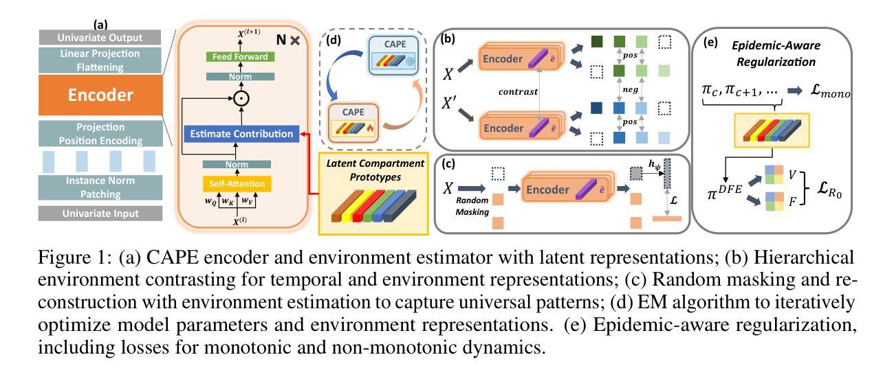 准确的疫情预测对于疫情准备至关重要,但现有的数据驱动模型往往很脆弱。这些模型通常针对单一病原体进行训练,在新疫情期间面临数据稀缺的问题,并且在病毒进化或干预措施引起的分布变化下会失效。然而,来自多种疾病的数十年监控数据提供了尚未开发的知识转移来源。为了利用历史的集体教训,我们提出了CAPE,这是用于疫情预测的第一个开源预训练模型。与忽视流行病学挑战的现有时间序列基础模型不同,CAPE将疫情动态建模为潜在人口状态混合体,称为“隔室原型”。它直接从监控数据中发现了灵活的隔室原型词典,使每个疫情都能表达为随时间变化混合体,将观察到的感染与潜在人口状态联系起来。为了促进稳健的泛化,CAPE结合了自我监督的预训练目标与轻量级的疫情意识调节器,使学到的原型与流行病学语义相符。在涵盖17种疾病和50多个地区的综合基准测试中,CAPE在零样本、少样本和全样本预测方面显著优于强大的基线。这项工作朝着既可转移又基于流行病学的预训练疫情模型迈出了有原则的一步。